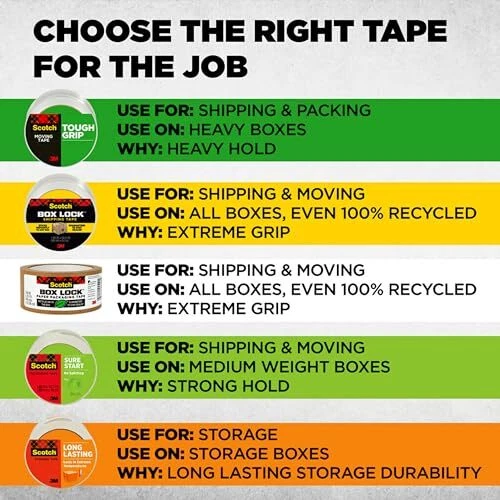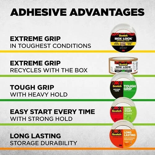 Scotch Tough Grip Moving Packing Tape helps you get a grip on big, heavyweight moving jobs. This moving tape holds strong on all box types, including harder-to-stick-to 100% recycled boxes, and is guaranteed to stay sealed (1). Designed with durable adhesive, this packaging tape secures up to 80 pounds of weight per box, even through rough handling conditions and moving truck rides. When you're packing your belongings for a big move, count on this split- and tear-resistant adhesive tape to ensure boxes stay fully packed and closed. Each roll of box sealing tape unwinds quietly and easily to make application a breeze. Fall-back tabs on the tape dispenser help ensure the tape doesn’t fall back on the roll, keeping it ready to seal the next box. One package contains six rolls of packing tape that are 1.88 in. x 22.2 yd., on a 1.5-in. core, each in its own dispenser. Scotch Brand delivers confidence in superior results to get package protection done well and effectively the first time. (1) If your box does not stay sealed, 3M will refund the purchase price of this tape. Proof of purchase required. Contact: 1-800-3MHELPS MOVING TAPE: 6 rolls of Scotch Tough Grip Moving Packing Tape in dispensers for convenient application offer excellent holding power for your packing and moving needs STRONG ADHESIVE: Durable adhesive easily secures moving boxes with up to 80 pounds of weight inside, even through rough handling conditions and moving truck rides FOR ALL BOX TYPES: Box tape that works on all types of boxes, including harder-to-stick-to 100% recycled boxes, and resists tearing and splitting IDEAL FOR: Clear tape that offers a tough hold on heavy boxes, making it perfect for sealing moving boxes full of items like dishes, books, toys and more QUIET UNWIND: Packing tape features a quiet and easy unwind to ease the task of all-day packing USE WITH TAPE DISPENSER: Dispenser (included) provides precise cuts and has fall-back tabs to help ensure tape doesn’t fall back on the roll, keeping it ready for the next use