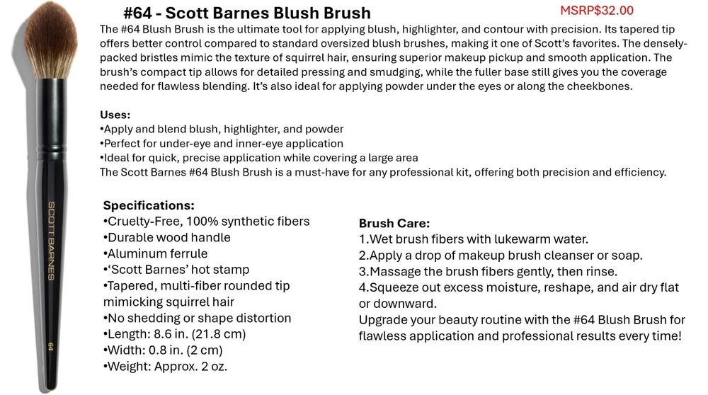 Scott Barnes #64 Blush Brush - New with Tag! Sealed! Authentic! Welcome to Brush Masters Empire! At Brush Masters Empire, we invite you to explore your ultimate eBay destination for makeup brushes, where unbeatable discounts and incredible deals await. Our unwavering commitment is to deliver quality products at unbeatable prices, sourced from various channels such as overstock items, shelf pulls, prior designs, discontinued products, and those with updated packaging or formula changes. Please note that some items may not include their original store display boxes. Your Satisfaction, Our Priority Your satisfaction is our paramount concern. Each product undergoes meticulous inspection to disclose any minor imperfections that might affect its performance. If you seek absolute perfection, we recommend exploring options at department stores. Easy Returns For your convenience, we offer a straightforward returns policy. You can return items within the specified timeframe, provided they remain in their original, unused condition. Unfortunately, for hygiene reasons, we cannot accept returns or issue refunds for items that have been used, tested, or are missing parts. Upon receiving the returned item, we will promptly process a refund. Quality, Reliability, and Transparency Our commitment revolves around your satisfaction, ensuring a reliable, trustworthy, and transparent shopping experience. Each item we offer is top-quality, genuine, and brand-new, all at fantastic prices. With dedicated customer service, you can expect prompt responses for a smooth, enjoyable, and hassle-free shopping journey. We prioritize transparency with accurate descriptions, clear images, and transparent policies, empowering you to make informed decisions. If you have any questions or concerns, please feel free to reach out, and we will respond to you immediately. We are here to assist you in any way we can. Proven Track Record With a proven track record of positive feedback and satisfied customers, we consistently exceed expectations as a reliable eBay seller. Trust us for dependable service, swift shipping, and secure packaging. Shop with confidence, discovering incredible deals and significant discounts without compromising quality. Your Ultimate eBay Destination For all your makeup brush needs, Brush Masters Empire is your ultimate eBay destination! Thank you very much for choosing us as your go-to source for quality makeup brushes. Welcome to Brushmasterempire, your ultimate eBay destination for makeup brushes, where unbeatable discounts and incredible deals await. Our commitment is to provide quality products at unbeatable prices, sourced from overstock items, shelf pulls, prior designs, discontinued products, and those with updated packaging or formula changes. Please be aware that some items may not include their original store display boxes. Your satisfaction is our top priority. We meticulously inspect each product to disclose any minor imperfections that might affect its performance. If you seek absolute perfection, we recommend exploring options at department stores. You can return items within the specified timeframe, provided they remain in their original, unused condition. For hygiene reasons, we cannot accept returns or issue refunds for items that have been used, tested, or are missing parts. Upon receiving the returned item, we will promptly process a refund. Our commitment is your satisfaction, ensuring a reliable, trustworthy, and transparent shopping experience. Each item we offer is top-quality, genuine, and brand-new, all at fantastic prices. With dedicated customer service, expect prompt responses for a smooth, enjoyable, and hassle-free shopping journey. We prioritize transparency with accurate descriptions, clear images, and transparent policies, empowering you to make informed decisions. With a proven track record of positive feedback and satisfied customers, we consistently exceed expectations as a reliable eBay seller. Trust us for dependable service, swift shipping, and secure packaging. Shop with confidence, discovering incredible deals and significant discounts without compromising quality. For all your makeup brush needs, brushmasterempire is your ultimate eBay destination.
