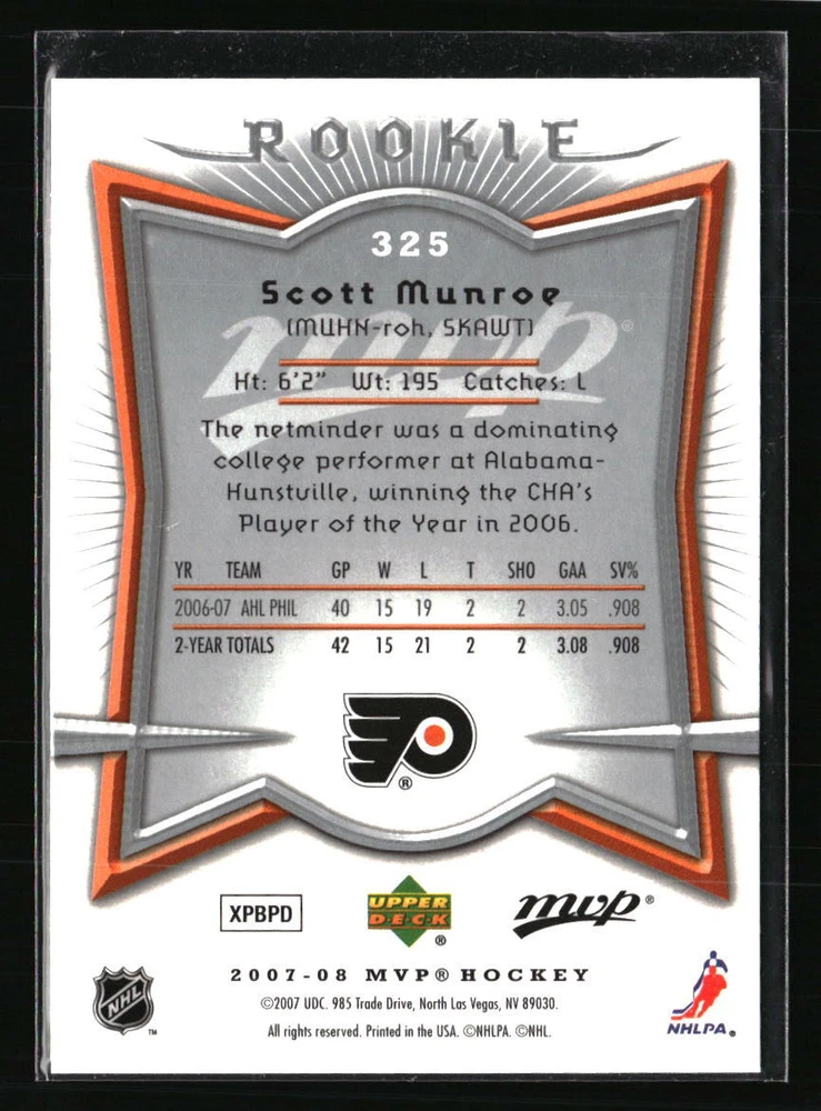 Scott Munroe 2007 Upper Deck MVP Flyers #325 RC Hockey Card