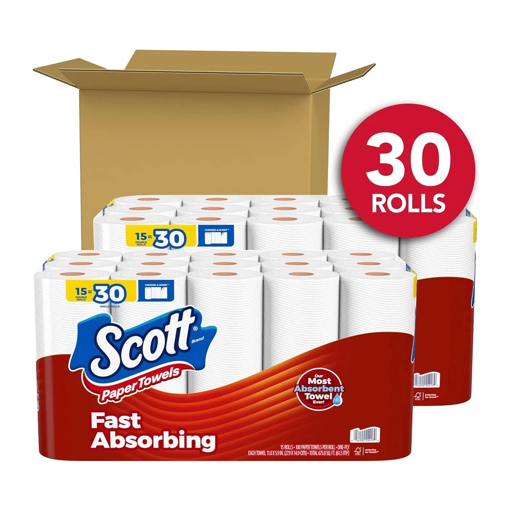 Scott Paper Towels, Choose-A-Sheet, 30 Double Rolls (2 Packs of 15) = 60 Regular Rolls (100 Sheets Per Roll) 30 Double Rolls of Scott Paper Towels (2 packs of 15), 100 sheets per roll (30 double rolls = 60 regular rolls); product and packaging may vary Trusted combination of value, strength, and absorbency, so you can clean your mess for less* (*than the leading national towel, fluid absorbed per dollar, based on avg retail price at grocery, drug, dollar, and mass outlets for 52 wk ending 6/17/23) Scott Paper Towels are more absorbent for your money** than the leading national towel (**Fluid absorbed per dollar, based on average retail price at a combination of grocery, drug, dollar, and mass outlets for 52 week 12/31/23) Our most absorbent towel ever, designed for fast and easy cleaning to tackle everyday messes; Scott leaves surfaces virtually lint-free for a simple, efficient clean you can trust FSC Certified: 100% of our fibers come from responsibly managed forests; Scott Choose-A-Sheet size allows you to choose the right sheet size for any task What are Scott Towels made of? Scott Paper Towels are made from a combination of soft and hardwood pulp fibers and water. The end result is a fast-absorbing towel that locks liquid to get the job done quickly. Are Scott Towels reusable? No. These paper towels are designed for fast and efficient clean up. Each sheet is recommended for single use. Is it safe to use Scott Towels in the microwave? If the product is used for microwave cooking, we recommend that you always note the precautions and follow the guidelines outlined in the microwave oven owner's manual, as any paper product can burn during microwave cooking if conditions are right. Are Scott Towels flushable? No. Our paper towels are designed to hold up to mess and not to break down for flushability. Are Scott Towels sustainably sourced? Yes! The wood pulp used in Scott Paper Towels comes from responsibly-managed forests that are replanted or naturally regenerated after harvesting. The cores are also 100% made from recycled paper. Take on daily messes with Scott Choose-A-Sheet Paper Towels, our most absorbent towel ever. With more sheets per dollar*, each paper towel roll comes with 100 sheets per roll and features Scott’s Choose-A-Sheet size that lets you choose the right sheet size for your task. These disposable paper towels are a trusted combination of value and strength, so you can use them anytime, anywhere, no matter the mess. Scott Paper Towels are more absorbent than the leading brand for your money** to help you tackle everyday messes at the right value. Plus, our paper towels are virtually lint-free when you wipe to help you leave any surface spotless. Scott is FSC-certified and has 100% paper fibers sourced from responsibly managed forests. Buy Scott Paper Towels in bulk and save yourself extra deliveries. (*vs. the leading brand regular roll select-a-size) (**Fluid absorbed per dollar, based on average retail price at a combination of grocery, drug, dollar, and mass outlets for 52 week ending 12/31/23)