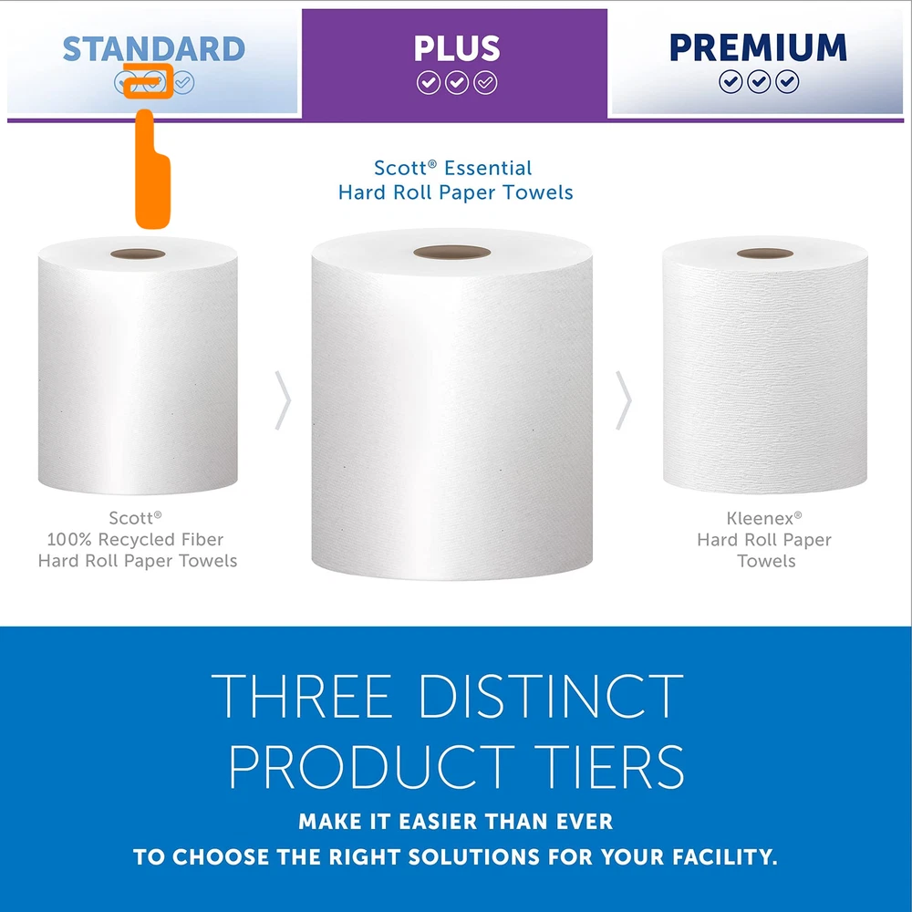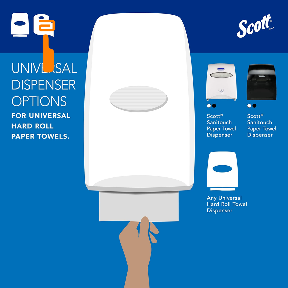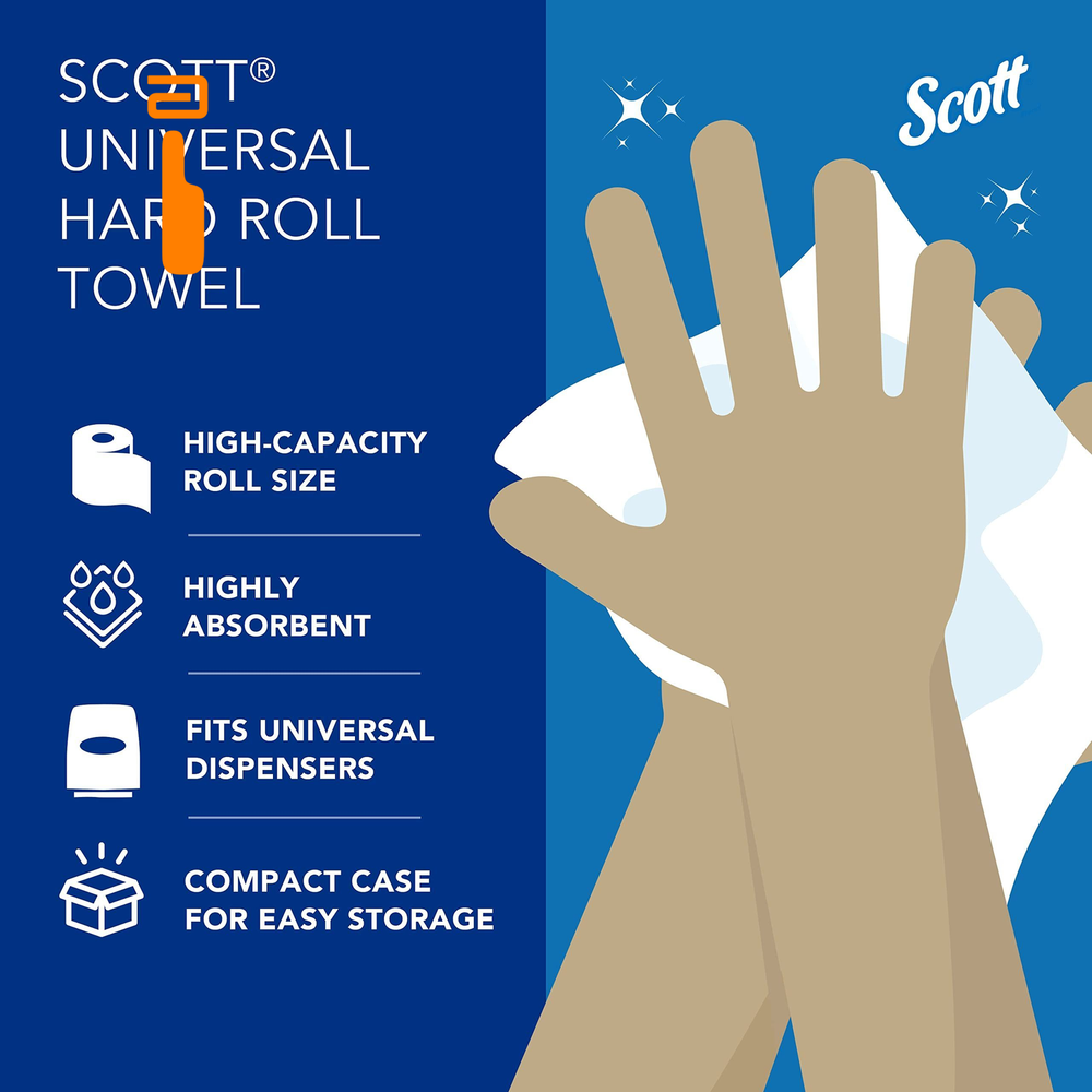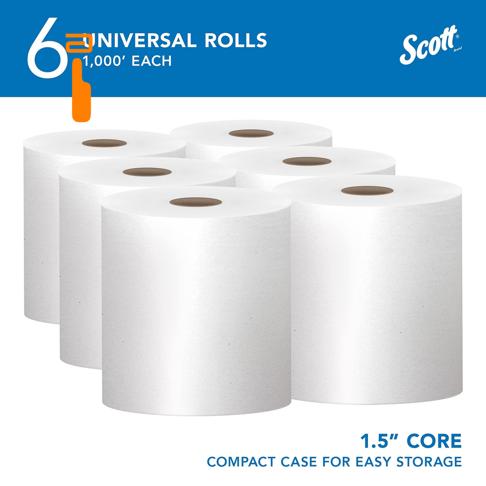 Scott Professional Essential Universal High-Capacity Hard Roll 6 Rolls, White Product Details 1,000'/Roll; 6 Rolls of Scott Essential Universal High-Capacity Hard Roll Paper Towels/Case; 6,000'/Case; with Absorbency Pockets; 1.5" Core; White Reduce maintenance time, run-outs and complaints with long-lasting bulk paper towels (as compared to a folded towel system) Compatible with many Kimberly-Clark Professional universal Hard Roll Paper Towel dispensers, along with many other universal hard roll paper towel dispensers designed to hold 1.5" cores Absorbency Pockets absorb lots of water fast for superior hand drying performance, so guests use fewer paper towels Designed for efficient general-purpose cleaning and drying, saving you money Scott® Hard Roll Paper Towels with fast-drying Absorbency Pockets™ provide efficient, reliable hand-drying for your washroom or break room. If you're looking for high-capacity commercial paper towels compatible with most universal roll paper towel dispensers, Scott® Hard Roll Paper Towels are an excellent choice for your business. Each roll has a core size of 1.5" and is compatible with a variety of Kimberly-Clark Professional™ dispensers and many universal towel dispensers. Scott® Hard Roll Paper Towels are designed to reduce maintenance time, run-outs and complaints. These absorbent recycled paper towels are designed for efficient general-purpose cleaning and drying, so your employees and guests will use less, saving you money.