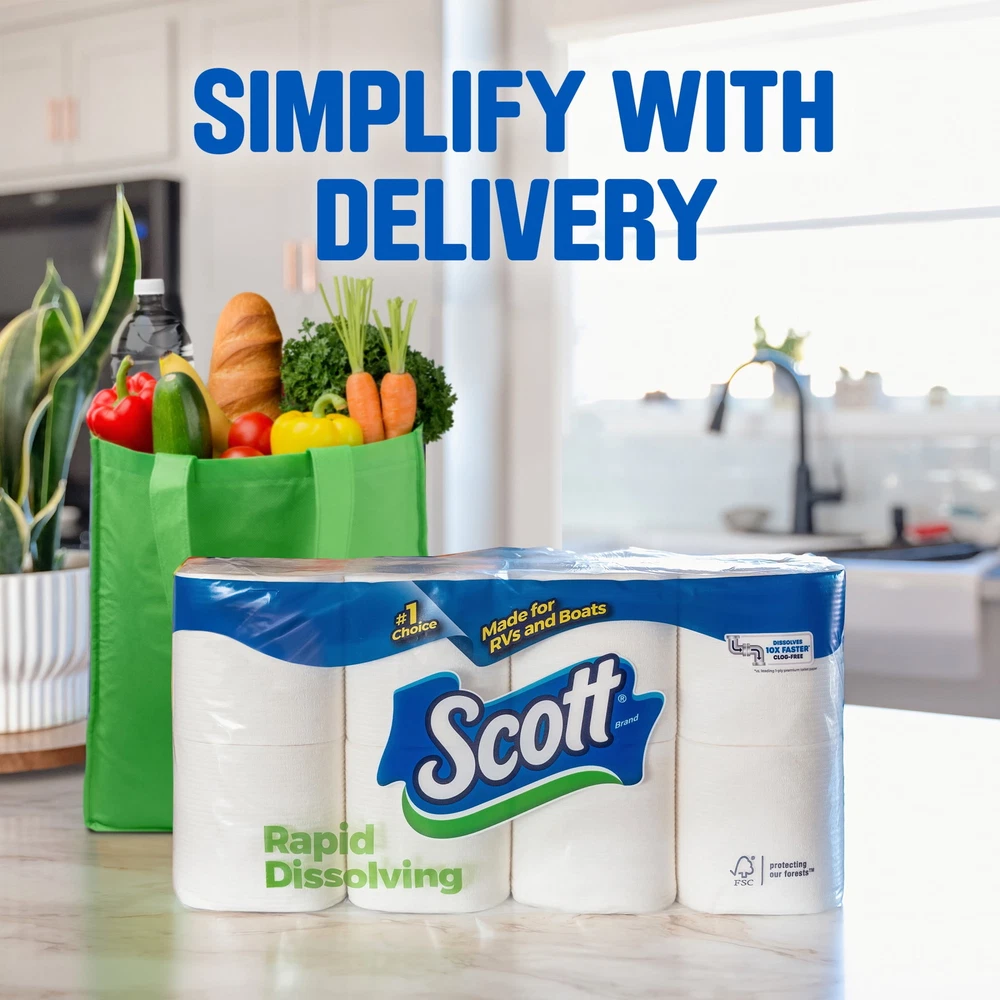 With Scott Rapid-Dissolving toilet paper, the #1 choice made for RVs and boats, you can spend less time worrying about clogged pipes and more time on what matters most. Scott Rapid-Dissolving toilet paper comes with 4 Double Rolls of 231 sheets, so you have plenty of toilet tissue that’s easy on your wallet, easy on your pipes. Our bath tissue is perfect for low flow toilets because it’s made with clog-free technology that makes it septic-safe. Plus, Scott Rapid-Dissolving 1-ply toilet paper breaks down 10x faster* so you can flush with confidence. Scott dedicated to help take care of our planet**. Get more with Scott and order Scott Rapid-Dissolving in bulk online! (*vs. leading brand’s 1-ply toilet paper) (**tissue made with responsibly sourced fibers) 4 Double Rolls of Scott Rapid-Dissolving Toilet Paper, 1-ply, 231 sheets per roll; toilet paper that's easy on your wallet, easy on your pipes Scott Rapid Dissolving toilet tissue is the #1 choice made for RVs and boats Clog-Free Technology: Scott 1-ply toilet paper rolls are made with clog-free technology, so it is septic-safe and ideal for low flow toilets Dissolves Quickly: Our bath tissue breaks down 10x faster* so you can flush with confidence (*vs. leading brand’s 1-ply toilet paper) Trusted for Sustainability: Scott is dedicated to help take care of our planet** (**tissue made with responsibly sourced fibers) Scott packaging and product may vary from images shown