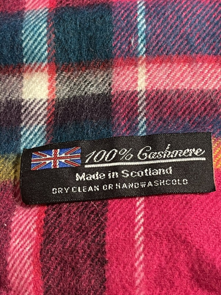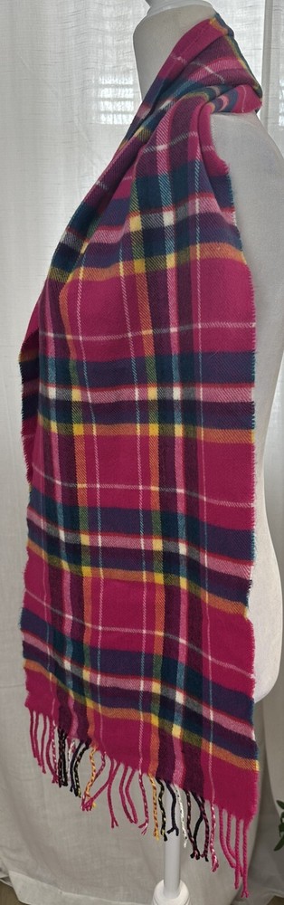 Beautiful 100% luxurious CASHMERE made in Scotland long scarf with fringe. Bright pink is the main color with accents of yellow blue and white. Measurements: 65” x 12.5”