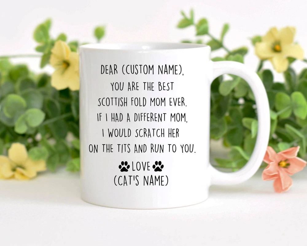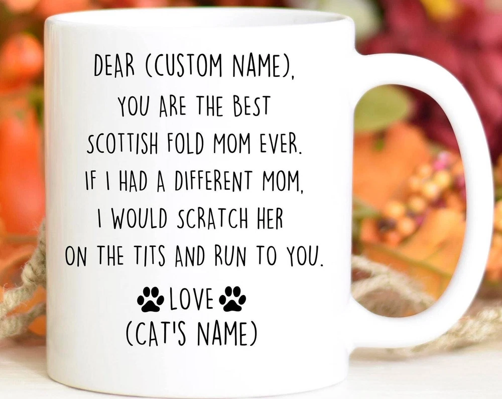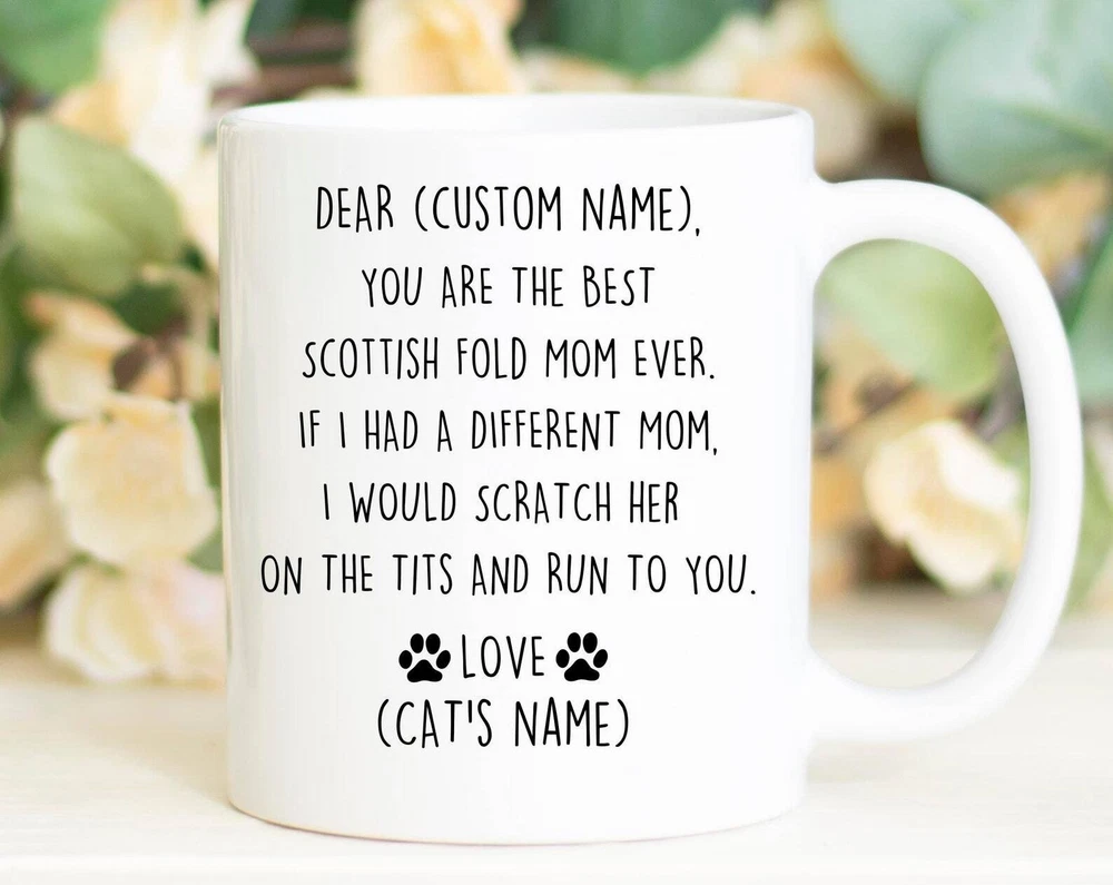 Scottish Fold Mom Birthday Gift Scot Fold Mom Christmas Gift Fold Cat Mom Valentine Gift Scot Fold Mom Appreciation Funny Scot Fold Gift Product Details.. This high quality 11oz. ceramic white mug has a premium hard coat that provides crisp and vibrant color reproduction sure to last for years. Perfect for all hot & cold beverages. The highest quality printing possible is used. It will never fade no matter how many times you wash it. Material: 100% Ceramic. Print both sides. Dishwasher and Microwave Safe. High Gloss + Premium White Finish. Printed in the U.S.A. Personalized & Custom. We support personalized and custom mug to add custom, when placing an order, you can add notes to the "order note" in shipping address section. Also you can contact us directly via message. Shipping Info. Ready to ship in 1 to 2 business days, All products are made-to-order and proudly printed in the United States. Shipped by USPS and DHL, You will receive your order in 5-7 days. Replace & Refund. All products are defective during shipping broken, chipped will be replaced free of charge. You are not satisfied with the product, we will refund 100% money to you. If any other issues arise, please do not hesitate to message, we would be more than happy to assist you.