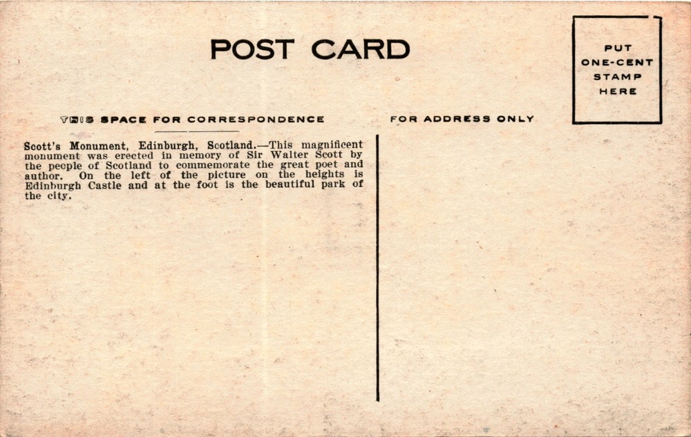 MAKE AN OFFER. THE MORE YOU BUY THE BETTER DEAL I WILL ACCEPT The postcard features Scott's Monument in Edinburgh, Scotland, which was built in honor of the renowned Scottish poet and author Sir Walter Scott. The monument was constructed by public subscription, with funds raised from admirers of Scott's work across Scotland. It stands tall in the city as a tribute to his literary contributions.