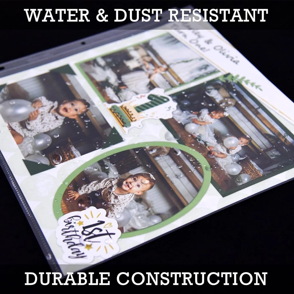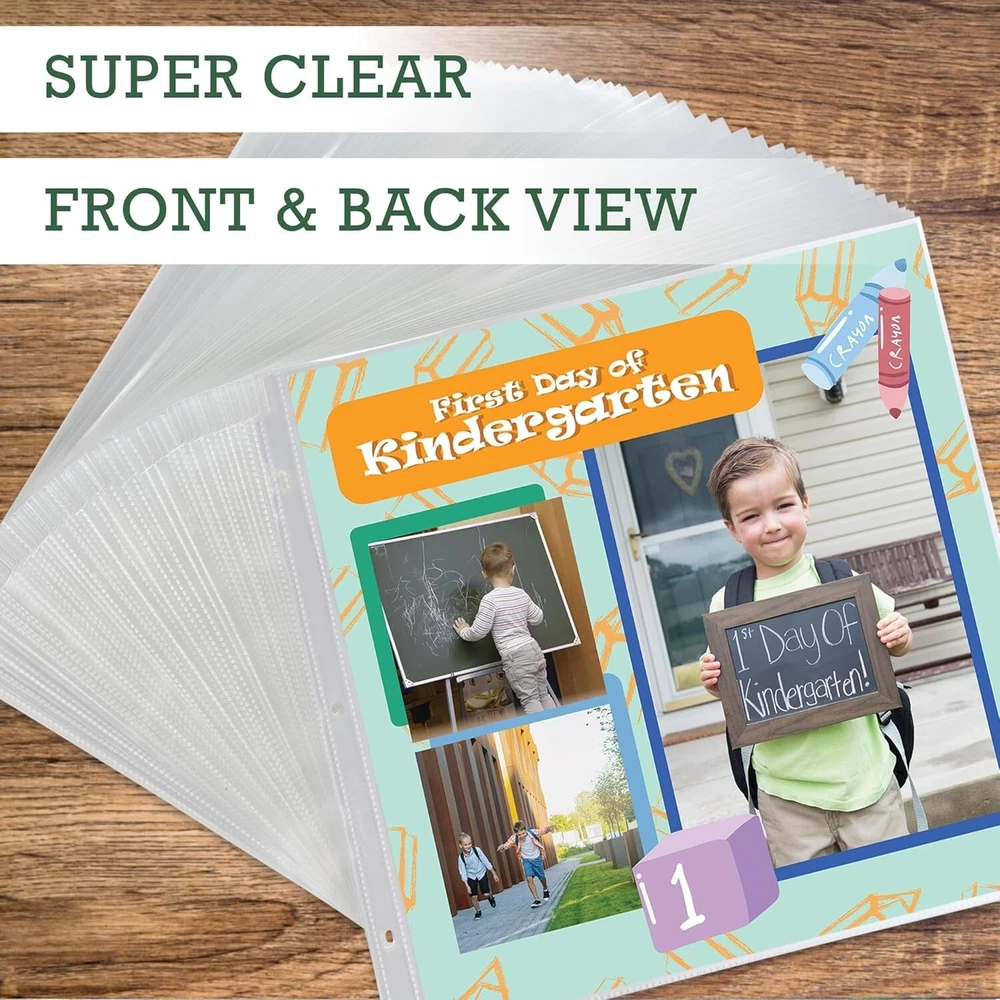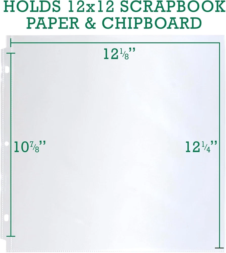 Scrapbook Refill Pages 12x12 Inch, 100 Pack, Fits 3 Ring Scrapbook Binders and 12x12 Photo Albums, Top-Loading, Heavy-Duty, Holds 2 Pages, Super Clear Scrapbook Refill Pages: This 100 pack of 12x12 inch scrapbook page protectors are top-loading sheets and feature a single clear pocket to easily refill scrapbook paper projects. Each sheet is large enough to fit two pages, front and back Super Clear Visibility: Made with polypropylene, the refill page protectors provide super clear visibility from front to back to display your scrapbooking inserts. The clarity enhances the overall presentation of the scrapbook or photos, giving it a more complete look Photo Album Size: Our photo album sheets fit in most standard 3 ring scrapbook binders designed to hold 12x12 inch paper. Ensures a secure and snug fit for your pictures, collectibles, or DIY projects Heavy Duty Material: With thick high-quality polypropylene, our protector sleeves can withstand frequent handling and storage without tearing or bending. Provides extra protection to scrapbook pages from wear and tear, ensuring they stay in good condition Archival Safe: These acid-free, PVC-free protectors prevent the transfer or lifting of ink, preserving the quality and appearance of your projects. With archival safe scrapbook refill pages, you can be confident that your valuable pages will last for s to come This 100 pack of 12x12 inch protectors are the highest quality refill pack, designed to ensure that all of your contents and memories remain safe, whether they are used daily or stored away in your scrapbook album. Made with thick polypropylene, these clear page protectors are durable and intended for frequent daily use. Our acid-free, archival safe protectors are perfect for your scrapbook paper, photos, scrapbooking memorabilia, and other supplies. They will keep all your memories intact, as ink won't be lifted or transferred onto the protectors. You can enjoy all your memories for s to come! Each page is large enough to fit two complete layouts, front and back. The top-loading feature makes it easy to slide your pages into each protector without any worries. These 12x12 scrapbook refill pages are perfect for adding additional pages to your scrapbook album or scrapbook binder. They will fit most 3-ring scrapbook binders or scrapbook photo albums designed to hold 12x12 inch paper. Get creative and design scrapbook layouts, photo albums, sticker layouts and more!