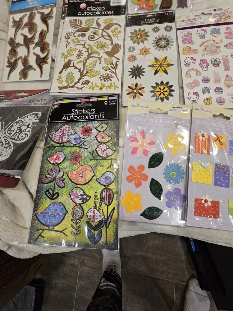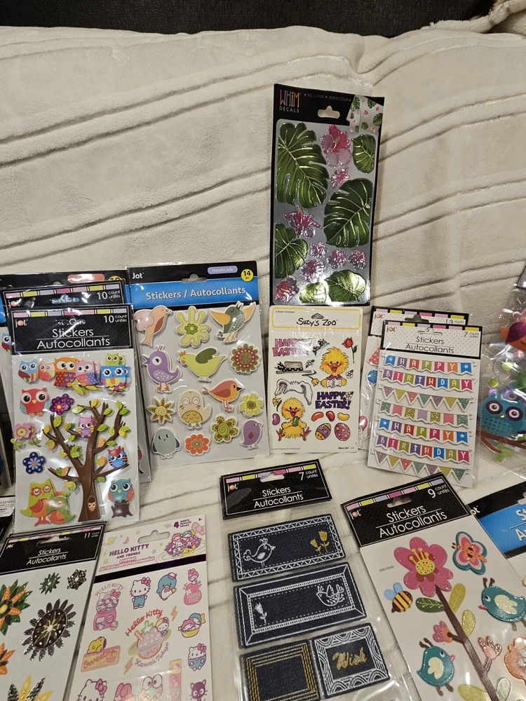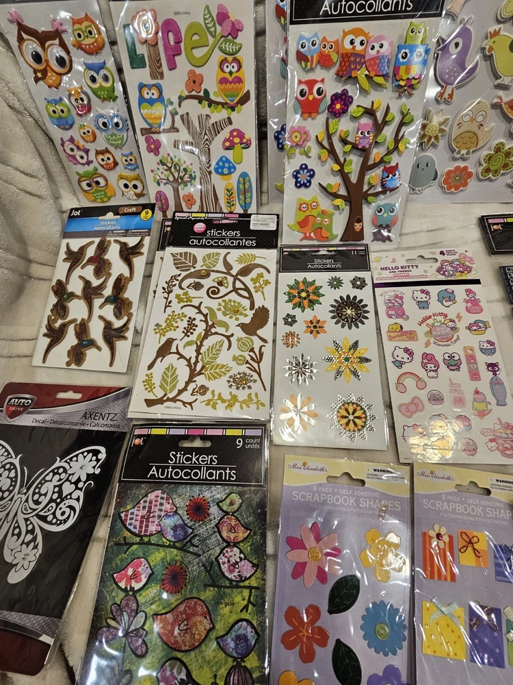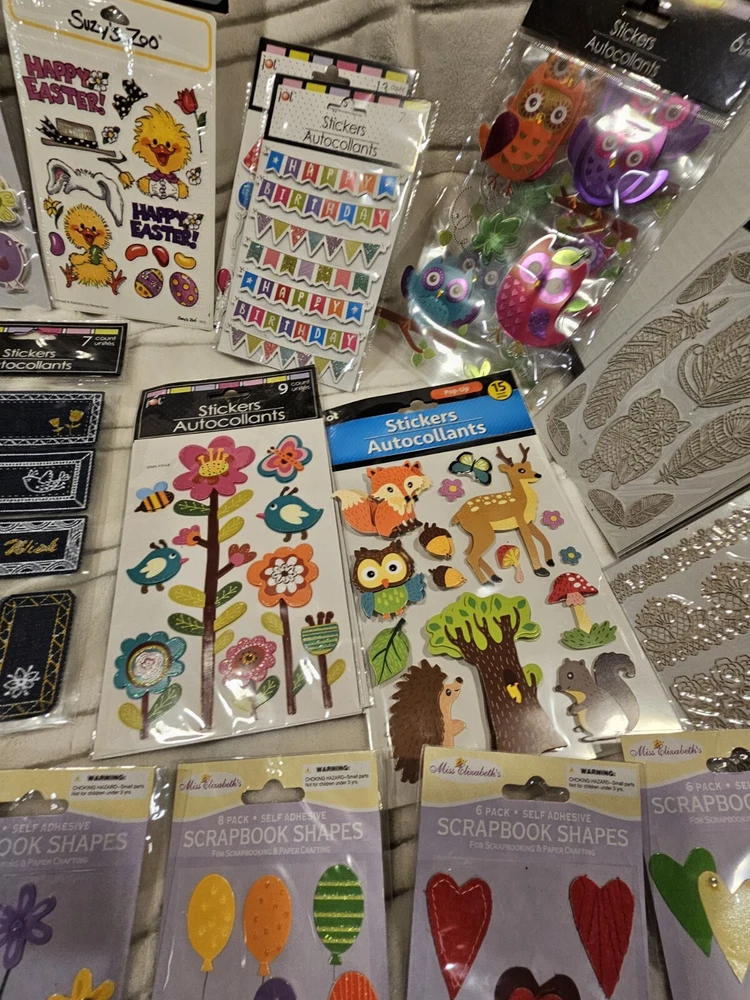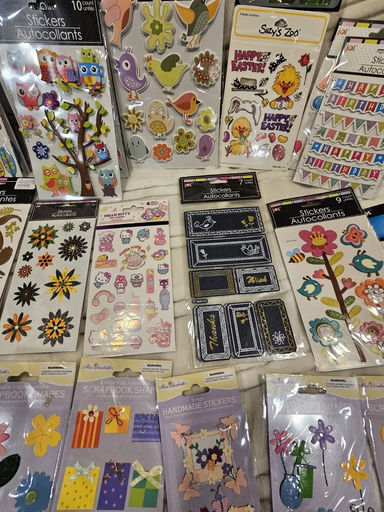New multiple packs of scrapbook stickers. There are multiple duplicate packs and some single packs. All unopened. There are 36 packages all together.