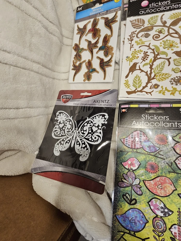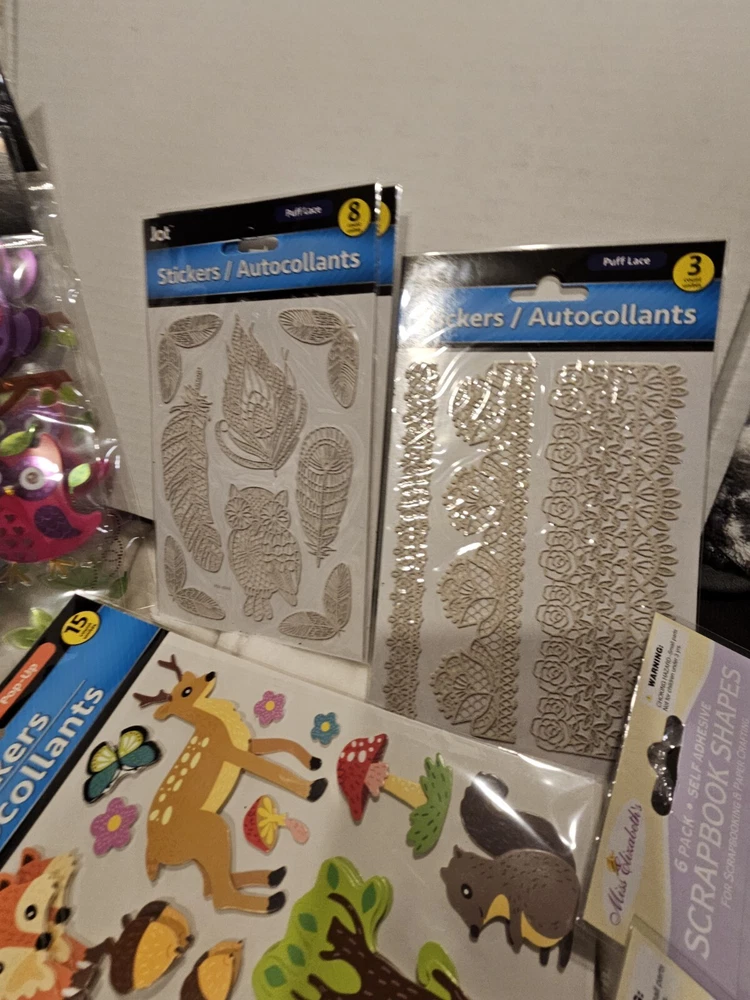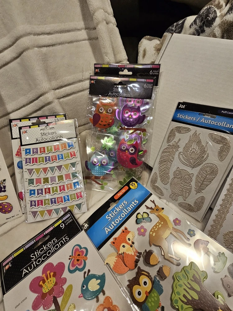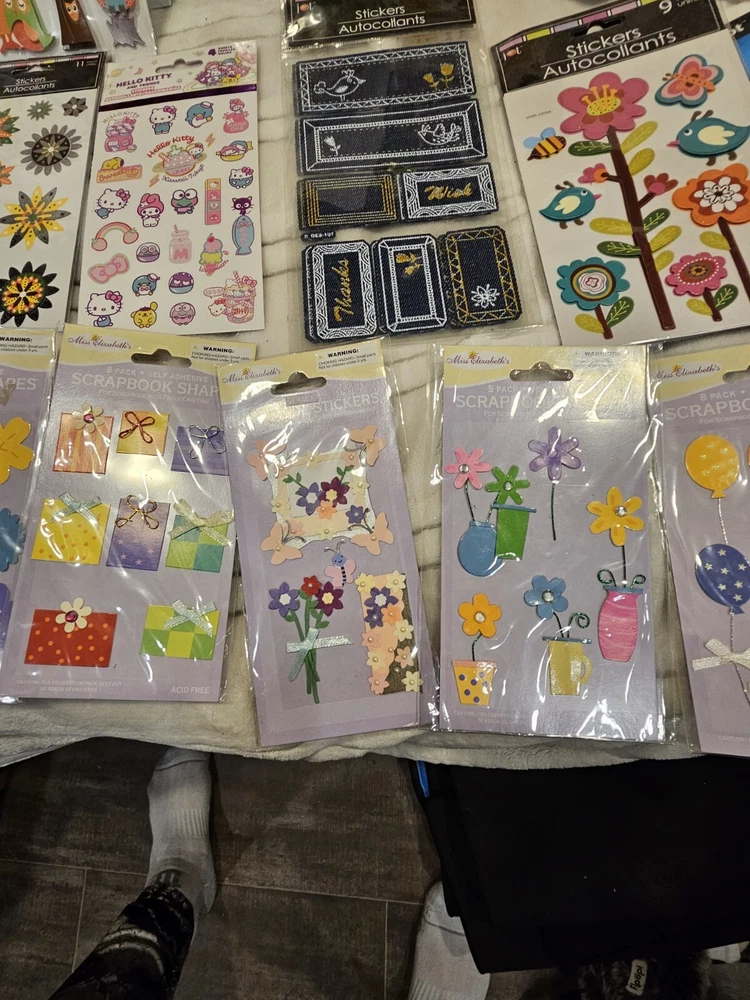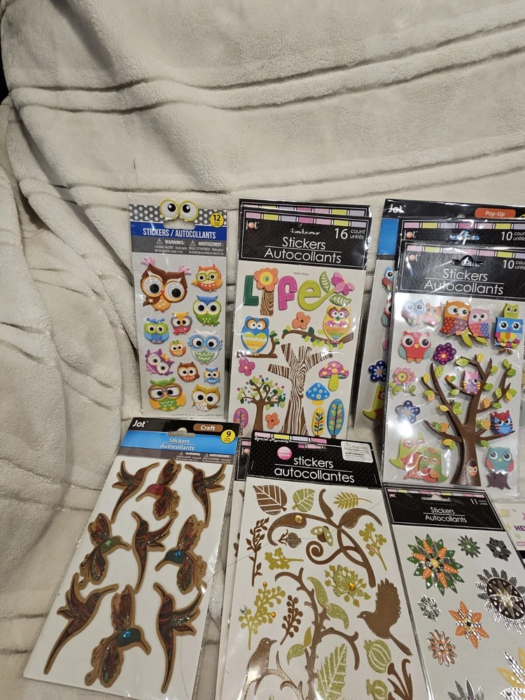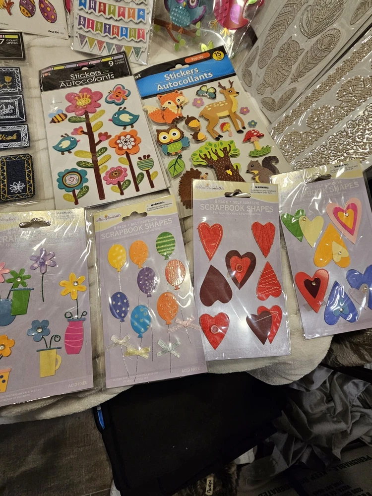 New multiple packs of scrapbook stickers. There are multiple duplicate packs and some single packs. All unopened. There are 36 packages all together.