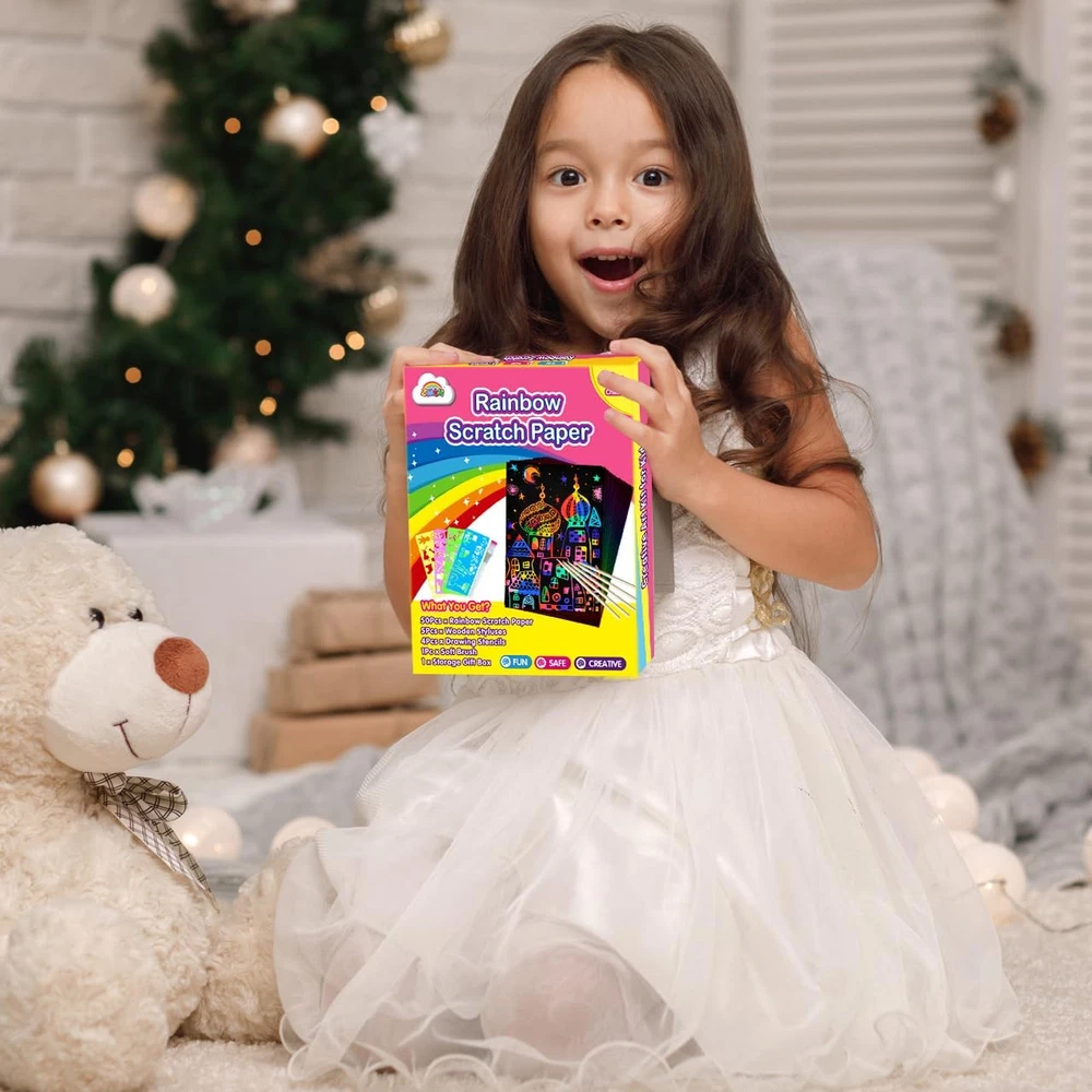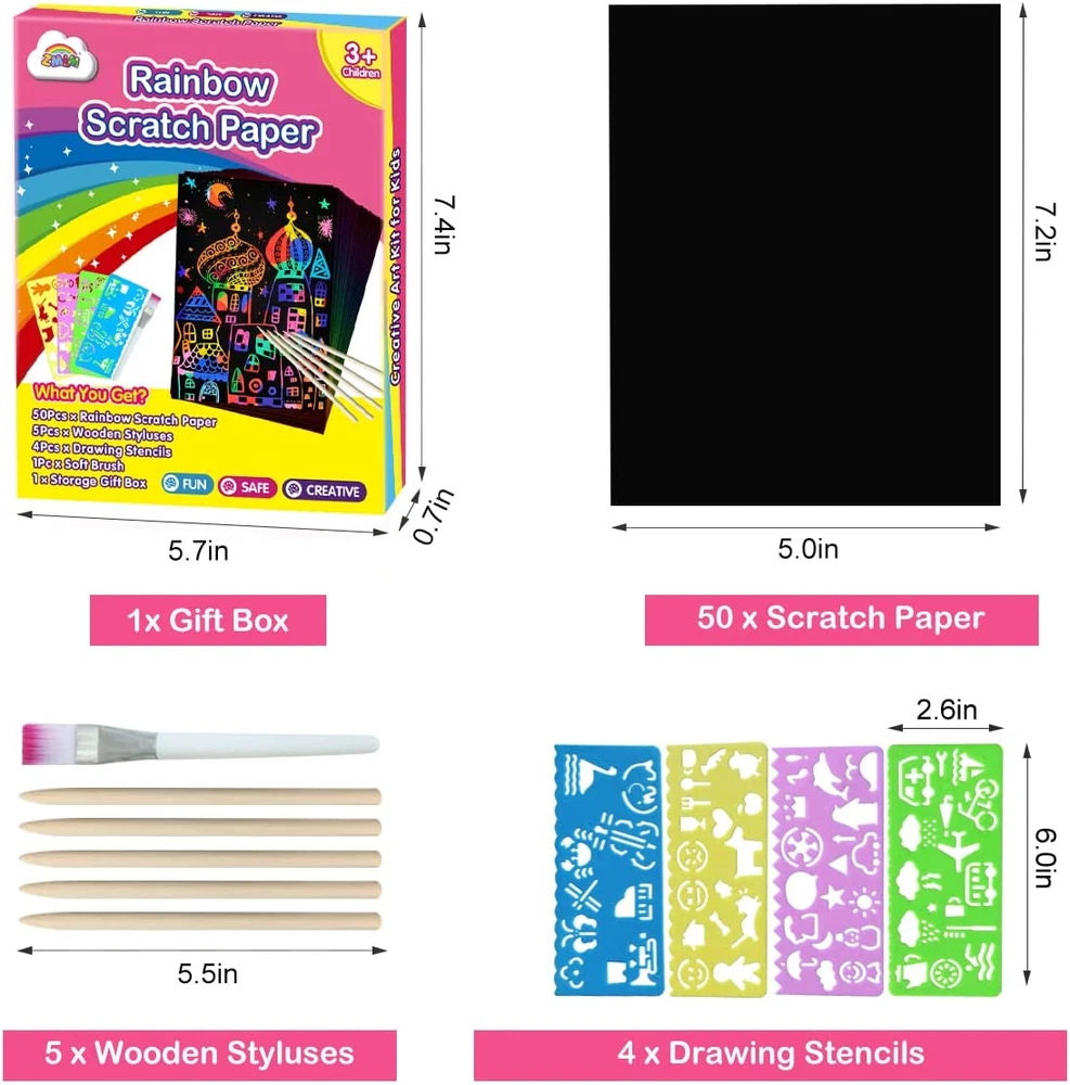 SCRATCH PAPER FOR KIDS: Use the scratcher to scratch away the black matte surface of the paper, revealing the background, so fun plus allows for amazing creative artwork, signs, and more! Makes an excellent arts and crafts activity for kids or grown-up artists EASY TO USE: Scratch paper art products feature bright colors and patterns hidden beneath a matte coating, plus a wooden stylus to reveal them with just a simple scratch. Package including: 50 Sheets Black Scratch rainbow art paper & 5 Wooden Stylus & 4 colorful stencils & 1 brush. Scratch rainbow art sheet size: 7.2 x 5 inch / 18.5 x 12.5 cm (L*W) CREATIVE SCRATCH ART GIFTS: Our scratch art is perfect for 5 year old girl birthday gifts.The arts and crafts for girls comes with an exquisite box, perfect travel toys & car game for kids. Ideal gift for kids birthday, party favors, class activity and Valentine, Easter, Halloween, Children's day, Thanksgiving, Christmas gifts and stocking stuffers INCREASE HAPPINESS: Small pocket scratch notepad perfect for travel and family road trips. Throw it in your backpack, bag or even your pocket and create whenever inspiration strikes. Very good for kids Christmas crafts stocking stuffers gifts for your boys and girls SCRATCH PAPER SUIT ALMOST PLACE: Use for multiple purposes, doodle, jot notes, create cards, sketch, draw, trace and more! The perfect outlet for your children's artistic thoughts Product Description The video showcases the product in use. The video guides you through product setup. The video compares multiple products. The video shows the product being unpacked. ZMLM Foil Art Kit for Kids Customer Reviews 4.4 out of 5 stars 166 4.4 out of 5 stars 166 4.4 out of 5 stars 166 4.4 out of 5 stars 166 4.4 out of 5 stars 166 Price $15.74 $ 15 . 74 $15.91 $ 15 . 91 $15.91 $ 15 . 91 $15.91 $ 15 . 91 $15.19 $ 15 . 19 Theme Princess & Unicorn Christmas Arts & Crafts Planet Space Dress Up Dinosaur & Animal Color Purple Red Blue Pink Green Age Range Kids Kids Kids Kids Kids Number of Foil Sheets 100 Colorful Foil Sheets 100 Colorful Foil Sheets 100 Colorful Foil Sheets 100 Colorful Foil Sheets 100 Colorful Foil Sheets Mess Free ✔ ✔ ✔ ✔ ✔