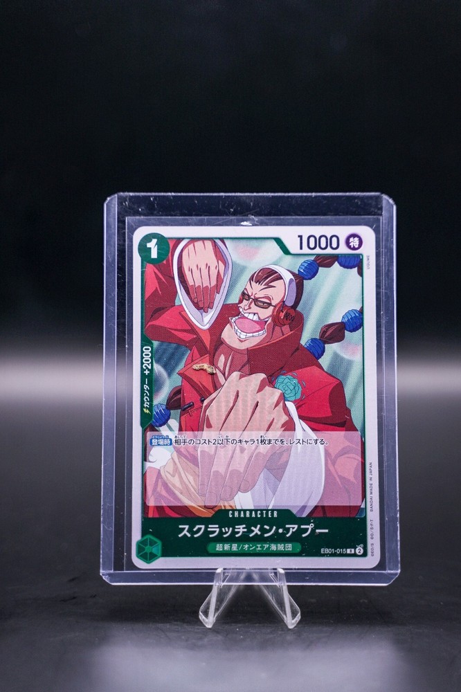 Illustrator:["Ugume"]Game:One Piece CCGRarity:RareAttack/Power:1000Set:Extra Booster: Memorial CollectionCard Number:EB01-015Additional Description:Scratchmen ApooManufacturer:NamcoCard Text:[On Play] Rest up to 1 of your opponent's Characters with a cost of 2 or less.Cost:1brand:NamcoFinish:FoilCard Name:Scratchmen ApooCard Type:CharacterLanguage:English