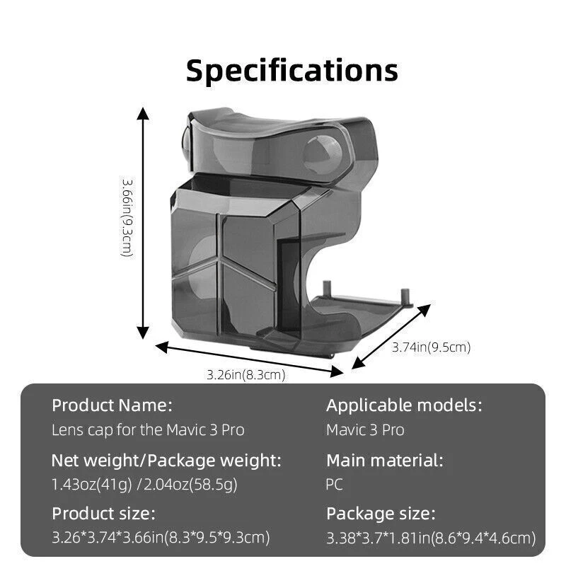 Product Description If you have any questions, please contact customer service first, do not open disputes easily, thank you! Feature: 1. Integrated protection of gimbal sensor to prevent foreign objects from colliding and scratching, 2. Tailor-made for Mavic 3 Pro, precise fit, stable, not easy to loosen, 3. Does not affect drone storage, protect gimbal cameras at all times during storage and transportation, 4. PC material, high gloss, strong toughness, no damage to the body, beautiful and practical, 5. Installation and disassembly in one step, saving time and effort. Specifications: Material: PC Applicable models: For DJI Mavic 3 Pro Color: Black Net weight: 1.43oz(41g) Package weight: 2.04oz(58.5g) Packaging includes: 1*Lens cap About Us We accept all payments authorized by eBay. powered by