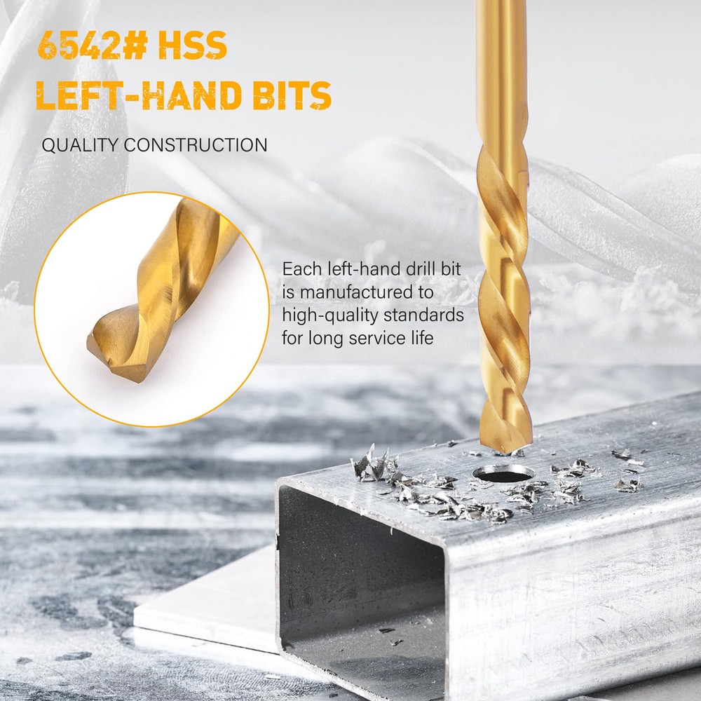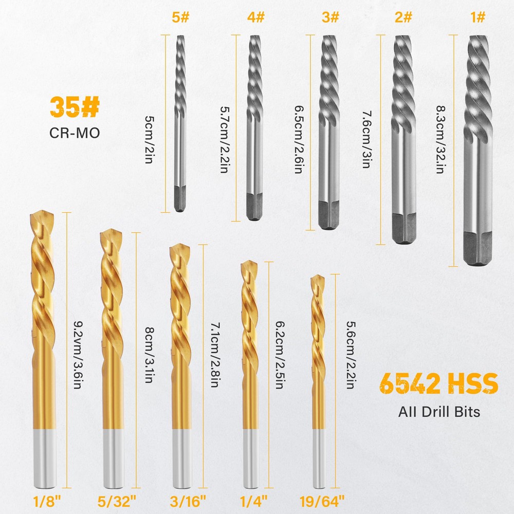 Save Time and Effort: Extraction bits easily remove broken screws, studs, bolts and other fittings effectively. Stripped bolt remover and extractor works on seized bolts, broken fasteners, and commonly called an easy out MULTI-PURPOSE: Bolt extractors that remove broken screws, whether working on wood or metal, are ideal for construction, automotive, home DIY projects or for industrial use. High and Resistant Material: Left-hand drill bits are made from cobalt-fortified high-speed steel for increased durability and service life. The 135° angle design of the head makes it easier to touch the fasteners Multiple Sizes: 5pcs #6542 HSS left-hand drill bits and 5pcs #37 alloy steel bolt extractors. Left-hand bits / reversed drillbits - 1/8", 5/32", 3/16", 1/4", 19/64" and Matching Alloy Extractors (stud outs) - 1#, 2#, 3#, 4#, 5# in a portable storage case that provides excellent protection and against lost screw extractors QUALITY COMMITMENT: Add cutting oil or spray water to cool during continuous use, any quality problems, please us.