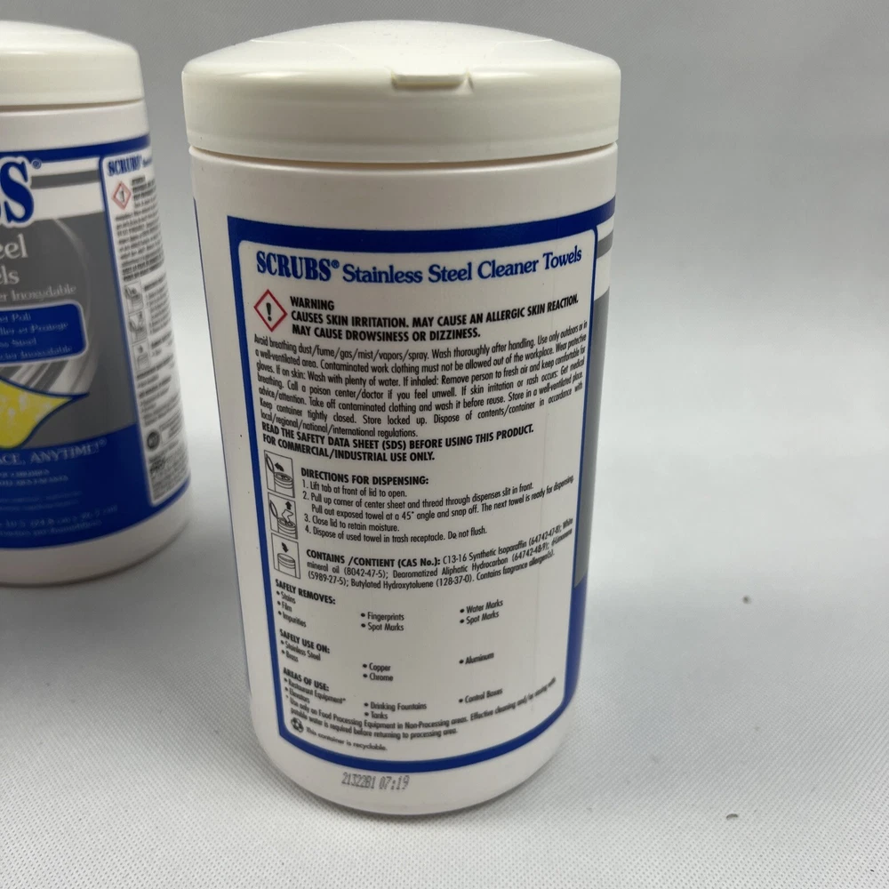 This pack of Scrubs 91930 Stainless Steel Cleaner Towels is perfect for keeping your stainless steel and appliance cleaning needs met. With 30 wipes included per canister and 6 canisters, you'll have plenty of cleaning power to tackle any mess. The towels are made of high-quality polypropylene material and come in a bright yellow color, making them easy to identify. Each towel measures 10 1/2 inches in width and 9 3/4 inches in length, providing ample coverage for your cleaning tasks. They are NSF rated and come in a canister for easy storage and transport. These disposable wipes are ready to use and will make your cleaning routine a breeze.