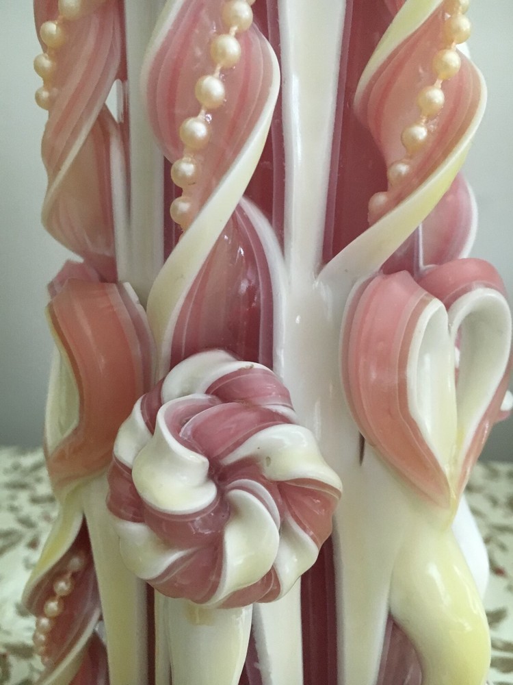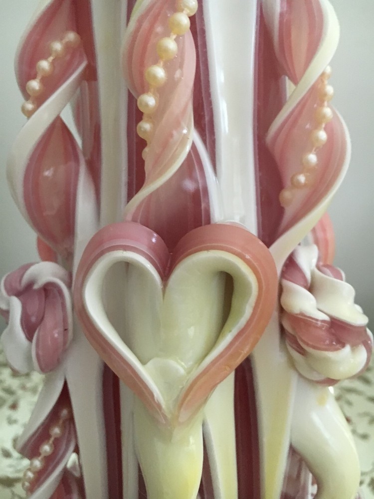 Original Sculpted Pink and White Medium Candle. Condition is New. Pink and white candle accented with sculpted hearts and flowers and white pearls. Entire candle illuminates once lit. White sculpted areas shine through with beautiful glow once lit. Candle stands 9.5 inches in height and 13 inches around in dimension. If burned down no more than 2 inches then you can refill with small votive candle insert and sculpted candle will remain without destruction for many years. Very elegant piece.