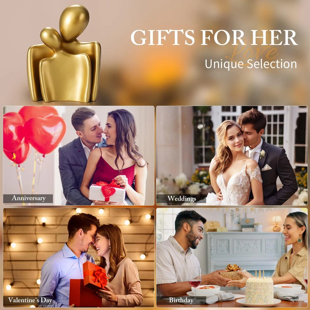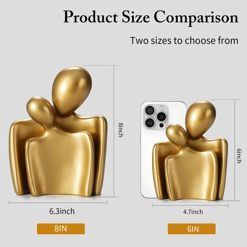 ROMANTIC FIGURINES: Statues of sweet couples who embrace each other warmly and promise a future together. This romantic figurine symbolizes great human feelings, depicting intimacy and love. Elegant, decent, artistic and modern feel and design. HIGH QUALITY: Made of high quality resin, strong structure, high quality, professional casting, meticulous, no odor, can be used indoors and outdoors. Man Size:6*4.5*2 inch,Women Size:4.75*3.15*1.5 inch ELEGANT DESIGN: The abstract art design of this sculpture is inspired by a lover's embrace, expressing love and warmth. Its elegant design makes this contemporary sculpture the perfect addition to the home environment. It's also a great way to beautify spaces and add romance to homes, villas, offices, libraries, yoga studios, cafes, art galleries, and hotels. PERFECT GIFT: The statue is not only an expression of love between couples, but also a perfect home decoration, business gift or gift for friends. It is the perfect gift for weddings, anniversaries, Valentine's Day and Mother's Day, as well as a love and blessing to relatives and friends. ORDER WITH CONFIDENCE: We're sure you'll love our couple statue. If for any reason you are not completely satisfied with the product, please let us know, we have a responsive and professional after-sales service team dedicated to providing our customers with the best possible support.