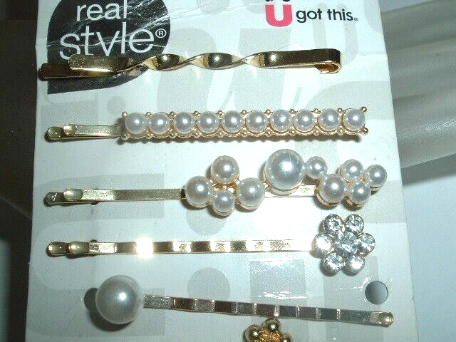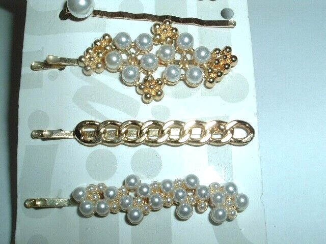 From the closing of a downtown Chicago boutique a set of 8 polished goldtone bobby pins with white pearls, white rhinestones and golden twists measuring 2" long. HALF PRICED, still on original card, never worn and really cutel. Condition is excellent.