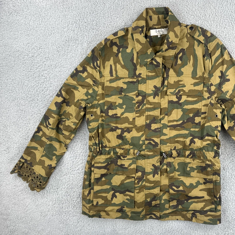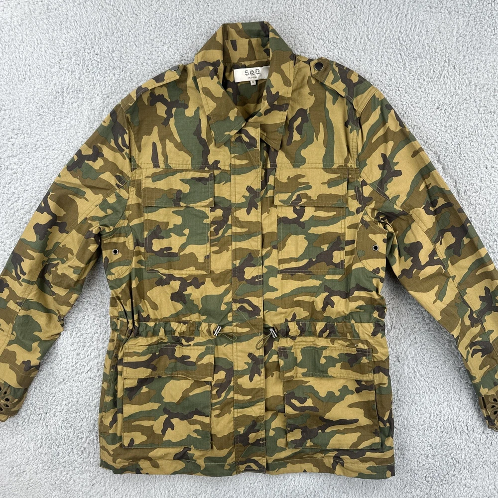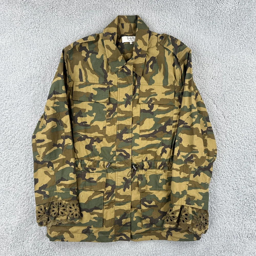 This Sea New York women's jacket in size S features a unique camouflage pattern with eyelet lace trim. The mid-length military-style jacket is made of comfortable cotton material, perfect for casual occasions. The multicolor design adds a pop of color to any outfit, making it a great addition to any wardrobe. Ideal for those who love colorful and unique fashion, this jacket is sure to make a statement.