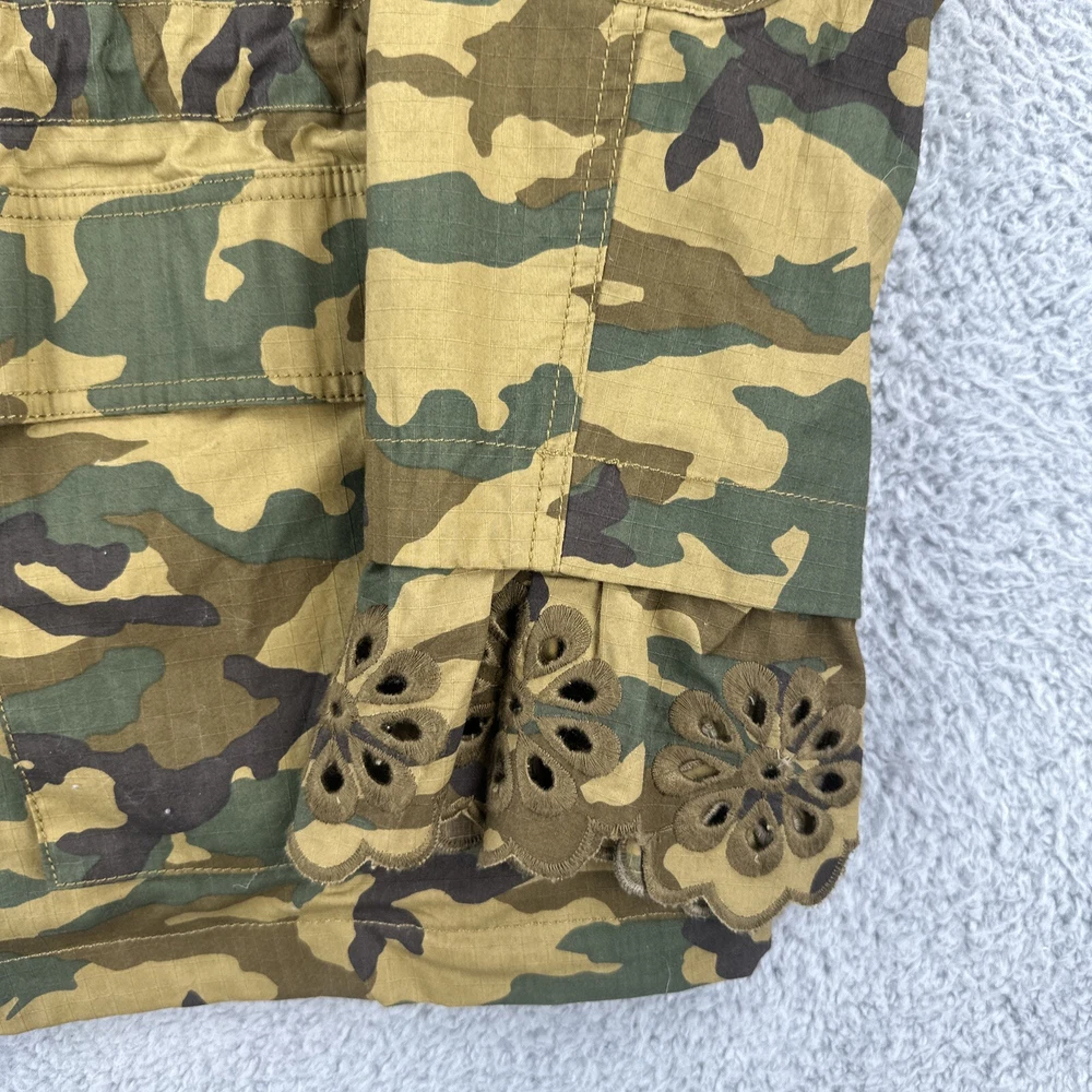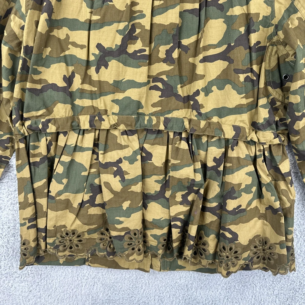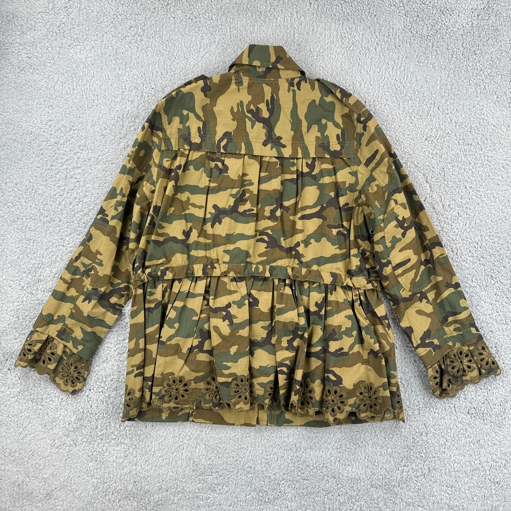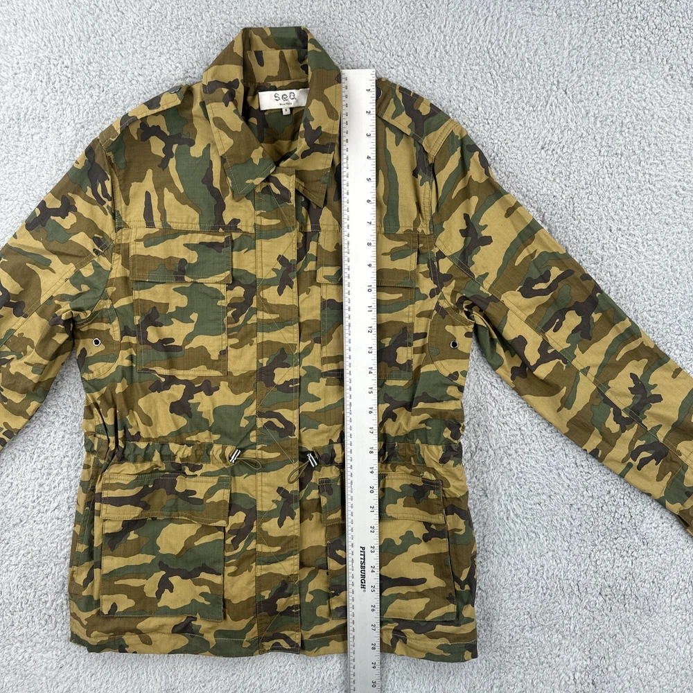 This Sea New York women's jacket in size S features a unique camouflage pattern with eyelet lace trim. The mid-length military-style jacket is made of comfortable cotton material, perfect for casual occasions. The multicolor design adds a pop of color to any outfit, making it a great addition to any wardrobe. Ideal for those who love colorful and unique fashion, this jacket is sure to make a statement.