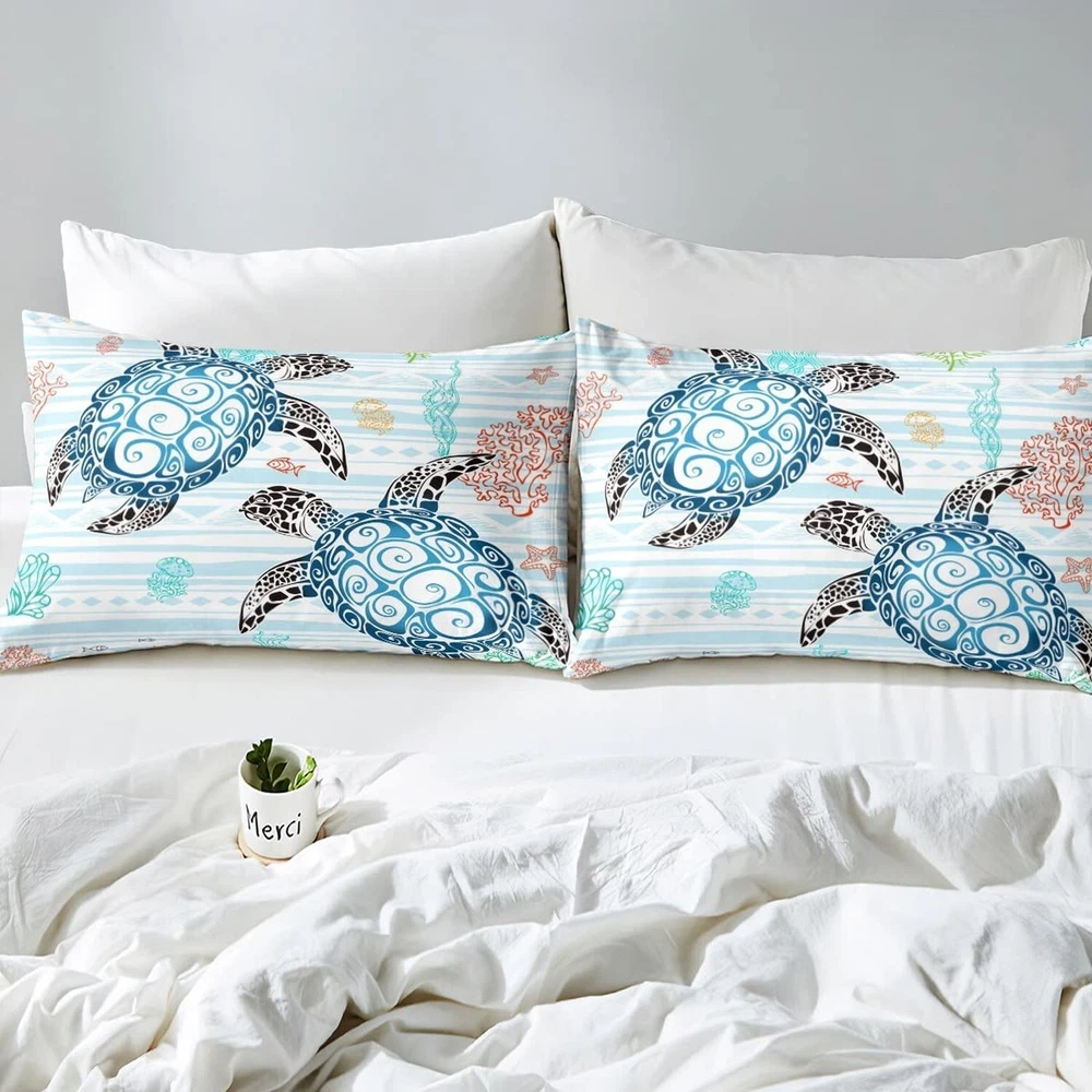 Sea Turtle Bedding Set Kawaii Room Decor, Coastal Beach Themed Comforter Set Full Size For Kids Teen Girls Boys Adult Bedroom, Blue White Stripes Quilt Sea Animal Underwater World Down Comforter Product Details Color: Blue Size: Full Brand: Erosebridal MPN: Does not apply UPC: Does not apply EAN: Does not apply Size: Full Included Components: 1 Comforter + 2 Pillow Cases Color: Blue Style: Modern Brand: Erosebridal Size: Full Included Components: 1 Comforter + 2 Pillow Cases Color: Blue Style: Modern Brand: Erosebridal Theme: Sea Turtle Pattern: Sea Turtle Material: Polyester Fabric Type: Material: Made With 400 Gsm Brushed Microfiber and Polyester Filling. Number of Pieces: 3 Seasons: All, Winter, Summer, Fall Thread Count: 400 Product Care Instructions: Machine Wash Manufacturer: Erosebridal Item dimensions L x W x H: 90 x 79 x 1 inches Product Dimensions: 90 x 79 x 1 inches Item Weight: 4.3 pounds Date First Available: April 15, 2023 Full size bed set includes 1 comforter (79 by 90 inches) and 2 pillow cases (20 by 30 inches). Machine washable and tumble dryable at low temperature for easy care. Do not bleach. Soft Fabric: Our comforter set with microfiber offers softness and breathability, which creates a comfortable sleep for you. The material is weaved by complicated post-grinding process. Lightweight: This textured bed set is lightweight but warm enough. It's convenient to take when you travel or take part in outdoor activities. It's suitable for all seasons. Other Products of the Same Pattern: Our store has other home series of the same pattern of the comforter set (bedspread,coverlet set, bed sheet, fitted sheet, duvet cover, throw blanket, tapestry, window curtains, tabletop, bath curtain, floor mat). You can decorate your room with the same style as you like. Fashion Design:The comforter and pillow cases are printed with pattern on the front side and white colored on the reverse (gamepad patterned items are printed both sides).This Modern printing Bedding Quilt,is Not Only match for Your Own Bedroom, Guestroom, Livingroom, But Also a present Idea for Boys Girls Teens Women Men Child Boyfriend Girlfriend Adults.