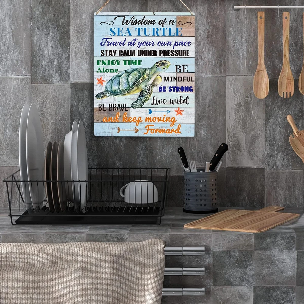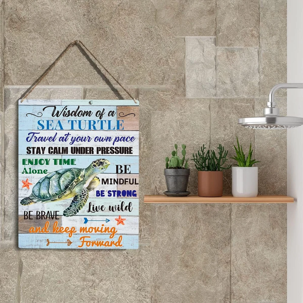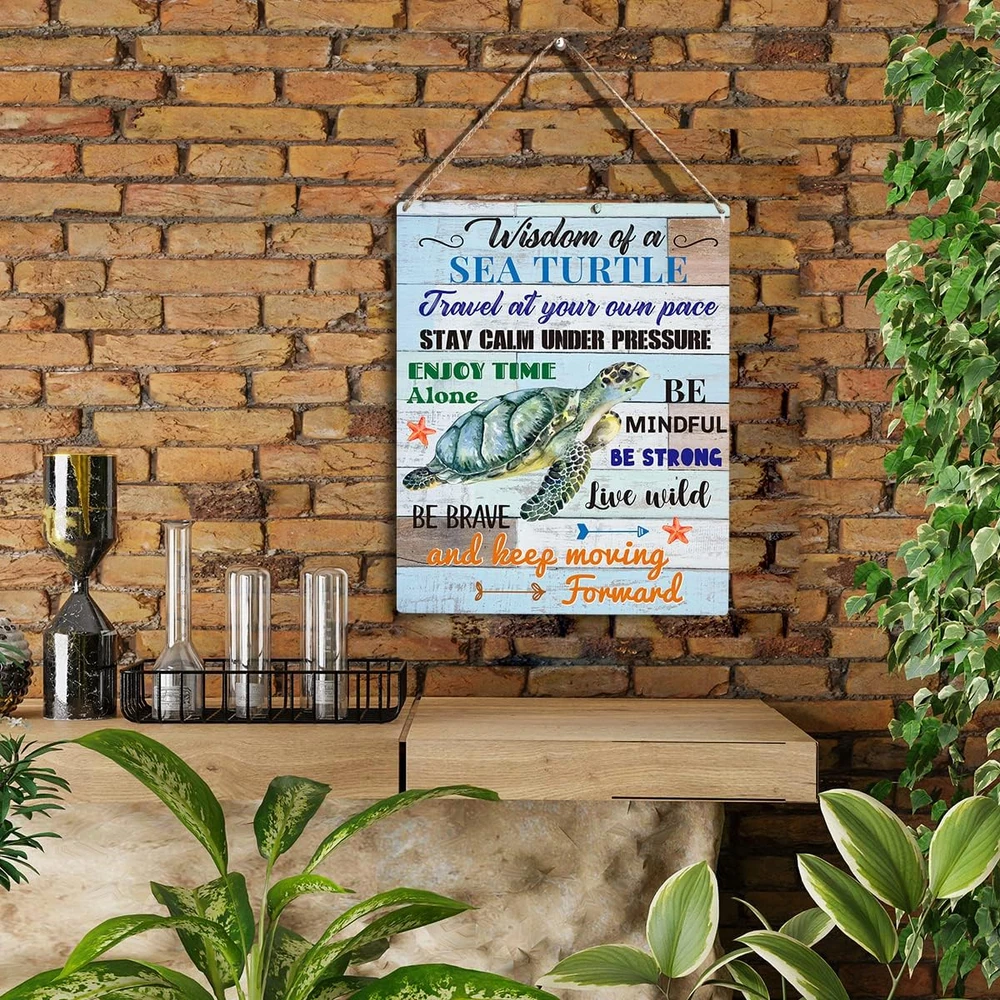 Product Dimensions: 10"L x 8"W Included Components: hanging holes and twine Item model number: 0019 gtin13: 313038473464 Mounting Type: Wall Mount Country of Origin: China Shape: Rectangular Pre-printed: Wisdom of a Sea Turtle Item Weight: 3.84 ounces Type: Does not apply Color: Brown19 Material: Wood Brand: Does not apply Theme: Words & Quotes Recommended Uses For Product: Office Style: Reliable UPC: 313038473464