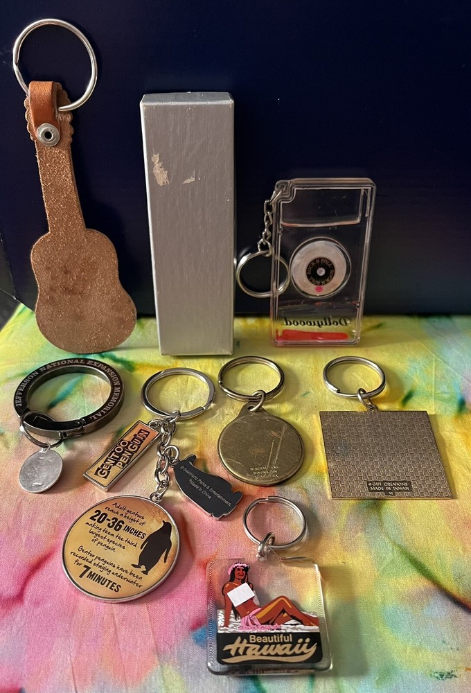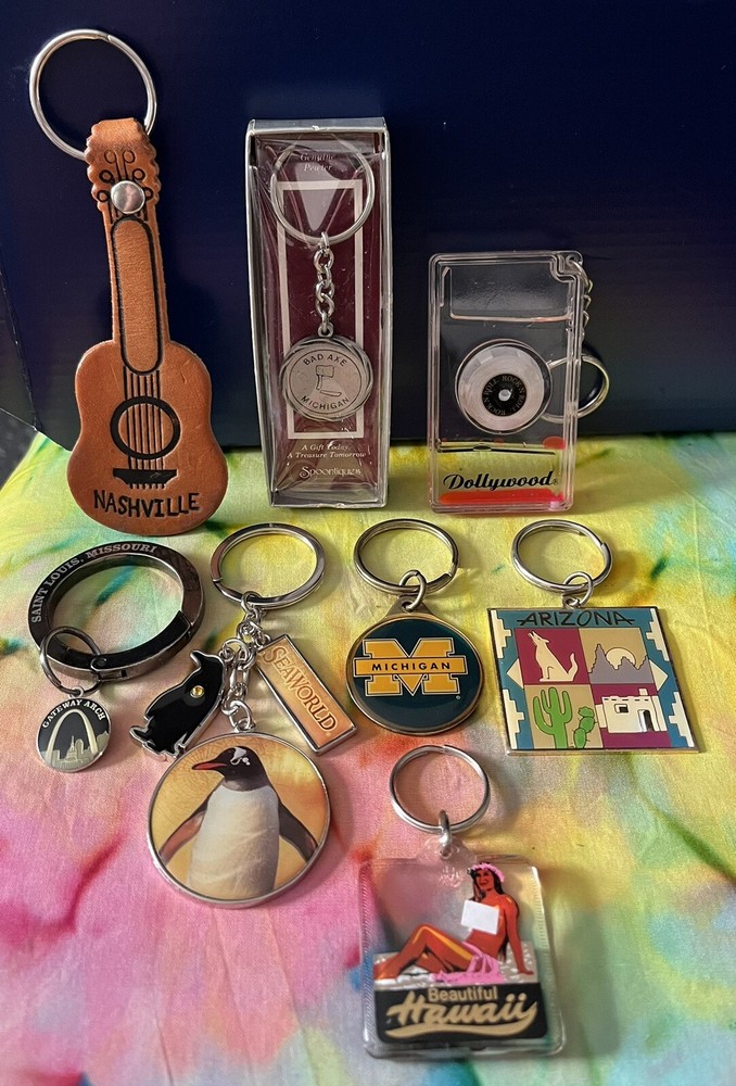 Cruising the USA Keychain / Keyring / Key Ring Lot of 8 SeaWorld; Dollywood; Hawaii; St. Louis, Missouri (Gateway Arch); Michigan; Arizona & Nashville 1) Leather Nashville Guitar Keychain 2) NIB (New in Box) Genuine Pewter “Bad Axe Michigan” Keychain from Spoontiques 3) “Rock N Roll” Dollywood Hot Pink Oil Drops in Water Keychain (drips around the central paddle wheel, but not as well as it did when new) 4) Saint Louis, Missouri Metal Keychain Loop Key Holder with Gateway Arch Charm 5) SeaWorld Keychain with 3 Gentoo Penguin Charms 6) Round Metal Michigan Keychain 7) Square Metal Arizona Keychain 8) Clear Acrylic or Lucite “Beautiful Hawaii” Keychain featuring a Bare Breasted Native Hawaiian Woman / Lady Please see pics for details and overall condition. The “Buy It Now” price is our preferred price, but we are open to offers on most items. Please message us about any questions or concerns before making a purchase. Thanks for looking and supporting our small business. We are blessed to be working from home, with the best coworkers we could ever ask for, each other! ❤️With love and blessings, (-: Dee & Chi :-)