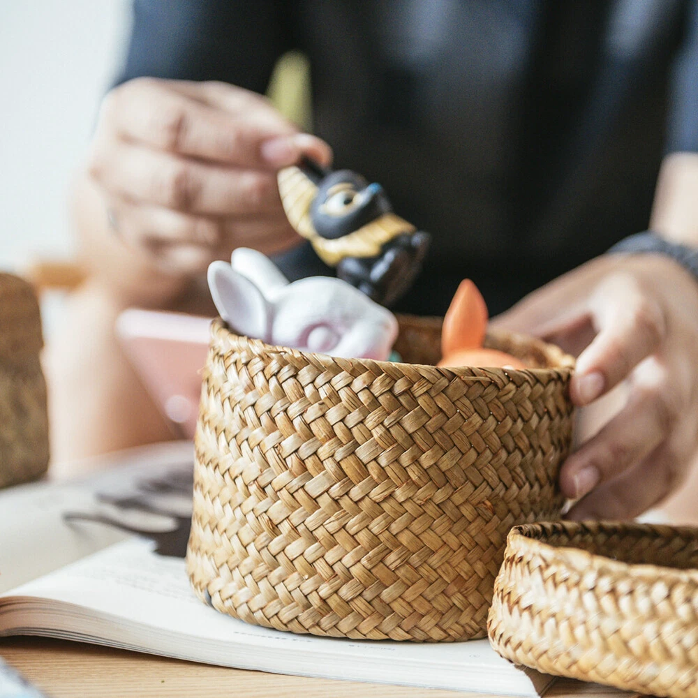 Seagrass Storage Basket Cylinder Woven Shelf Dust-proof Snacks Toys Organizer