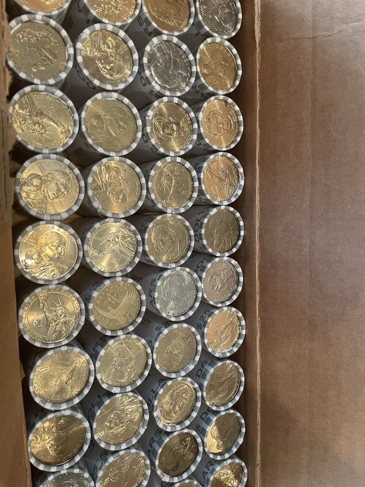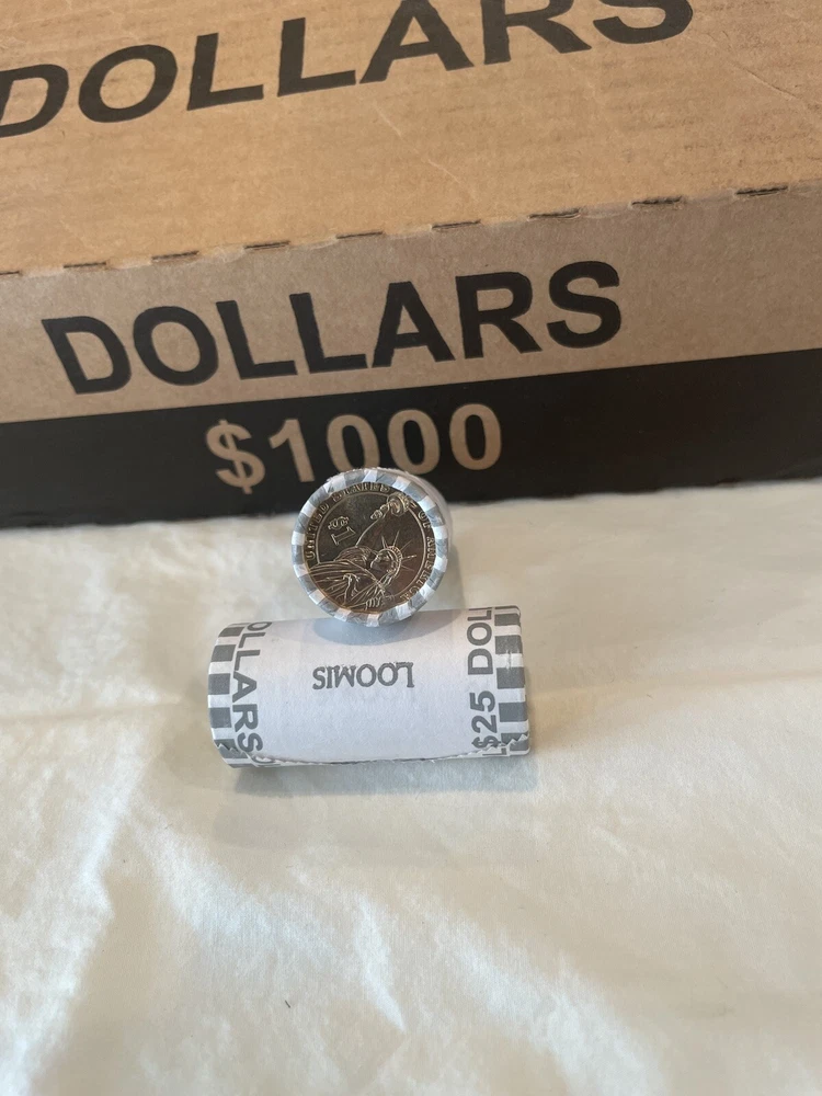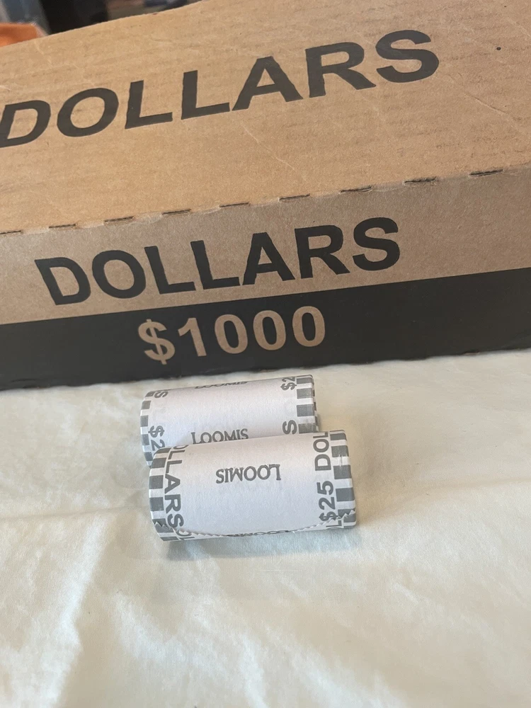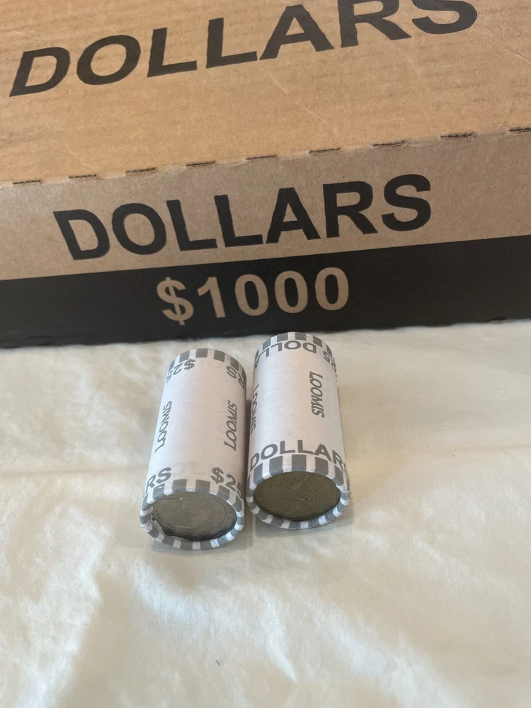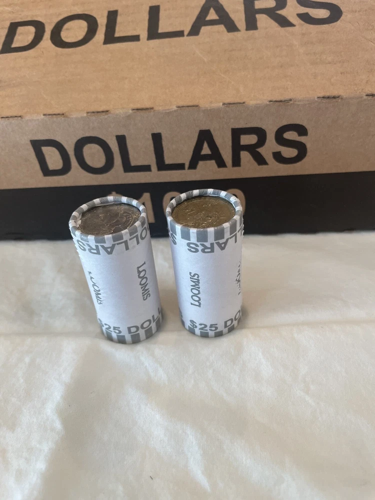 For sale is 1 Roll Of Dollar Coins, SEALED, Bank/ Fed Rolled, $25 face value You will receive 1 roll from a freshly opened $1000 box of dollar coins This 1 roll will be shipped 1 business day GUARANTEED!! Will be shipped with Priority Mail, fast and free! Please ask any questions or concerns before purchase Disclaimer: you are purchasing bank sealed rolls, meaning that I do not know the contents of the rolls and have no way of influencing it. If you are looking for dates I do not know the dates If you are searching for silver I do not in any way advertise that there is silver in the rolls. Personally I have found silver searching boxes that came from the same source. To ensure customer satisfaction, I individually roll each bank roll in paper and tape it closed, this is to protect the rolls in shipping. In the event that the rolls do crack open inside of the paper protection due to extremely rough handling, please have my word that this 'opening' was done during shipping as I do not search rolls before packaging. As always, please feel free to contact me before your purchase and if you have a question or concern about anything once you receive your item. In addition I offer free 30 day returns ( I pay return shipping), for any dissatisfaction. you will receive an 100% refund as long as the item is returned in the state I sold it as, thanks.