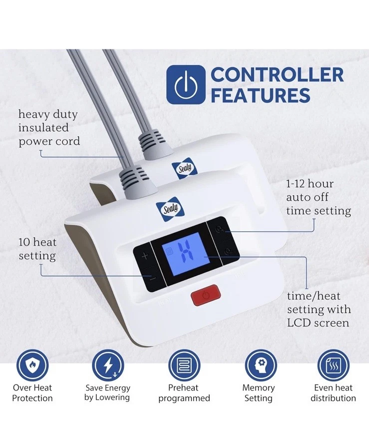 Open box new item! Coral Fleece(top Layer) ★【PREMIUM MATERIAL】 The top layer of this plush heated mattress pad is made of premium breathable Coral Fleece, known for its ultimate softness and plush texture, providing a luxurious feel against the skin. It also offers excellent thermal insulation, keeping you warm and dry by trapping body heat. Heated mattress pad with plush top is an ideal choice for those seeking comfort, warmth, and durability. ★【WHY CHOOSE SEALY HEATED MATTRESS PAD】If you are not a fan of getting into a cold bed, especially during the winter. This Sealy heated mattress pad is ideal to preheat the bed. Ultra comfort with coral fleece offers the best of both worlds. This electric mattress pad has deep pockets that fit most mattresses. The skirt contains strong elastic that helps it stay put. The padding on top is plush enough that there is no sensation of wires when lying on it, which makes for a great night sleep. ★【MAXIMUM SAFETY & WARMTH】Upgraded heating wire is adopted in the plush heated mattress pad, which has passed the ETL and FCC safety standard. Sealy electric mattress pad can promote blood circulation, help relieve muscle soreness and joint pain by providing heat therapy, and warm your cold hands and feet. ★【PROGRAMABLE CONTROLS】The heated mattress pad has 1-12 hours automatic power off and overheat protection, don't worry about forgetting to turn off the power, make you more assured; dual controller, 10 temperature gears, simple operating system make it easy to use, you can freely adjust your own optimal temperature. ★【EASY CARE & MACHINE WASHABLE】This heated mattress pad is machine washable, just unplug the power cord from the controller and throw it into the washing machine under 30℃ water temperature to wash, clean and durable. CAUTION: DO NOT DRY CLEAN. DO NOT BLEACH. DO NOT IRON.DO NOT PLUG IN AND POWER UP YOUR HEATED PRODUCT WHILE DAMP. DO NOT USE UNTIL IT IS COMPLETELY DRY.