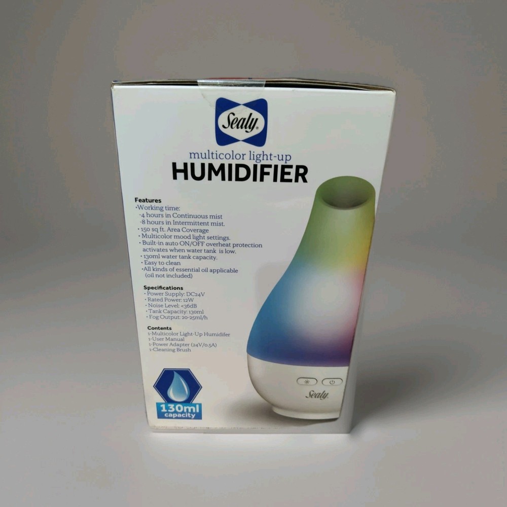 The Sealy Multicolor Light-Up Humidifier Aroma Diffuser is a stylish and functional addition to any room. With its white plastic design and LED lights, this humidifier not only helps to improve indoor air quality but also adds a touch of ambiance. It offers two mist modes for customizable humidity levels and features like a night light, portable design, and quiet operation for a convenient user experience. Perfect for small rooms, this Sealy humidifier from 2022 is an essential component for maintaining a comfortable environment.