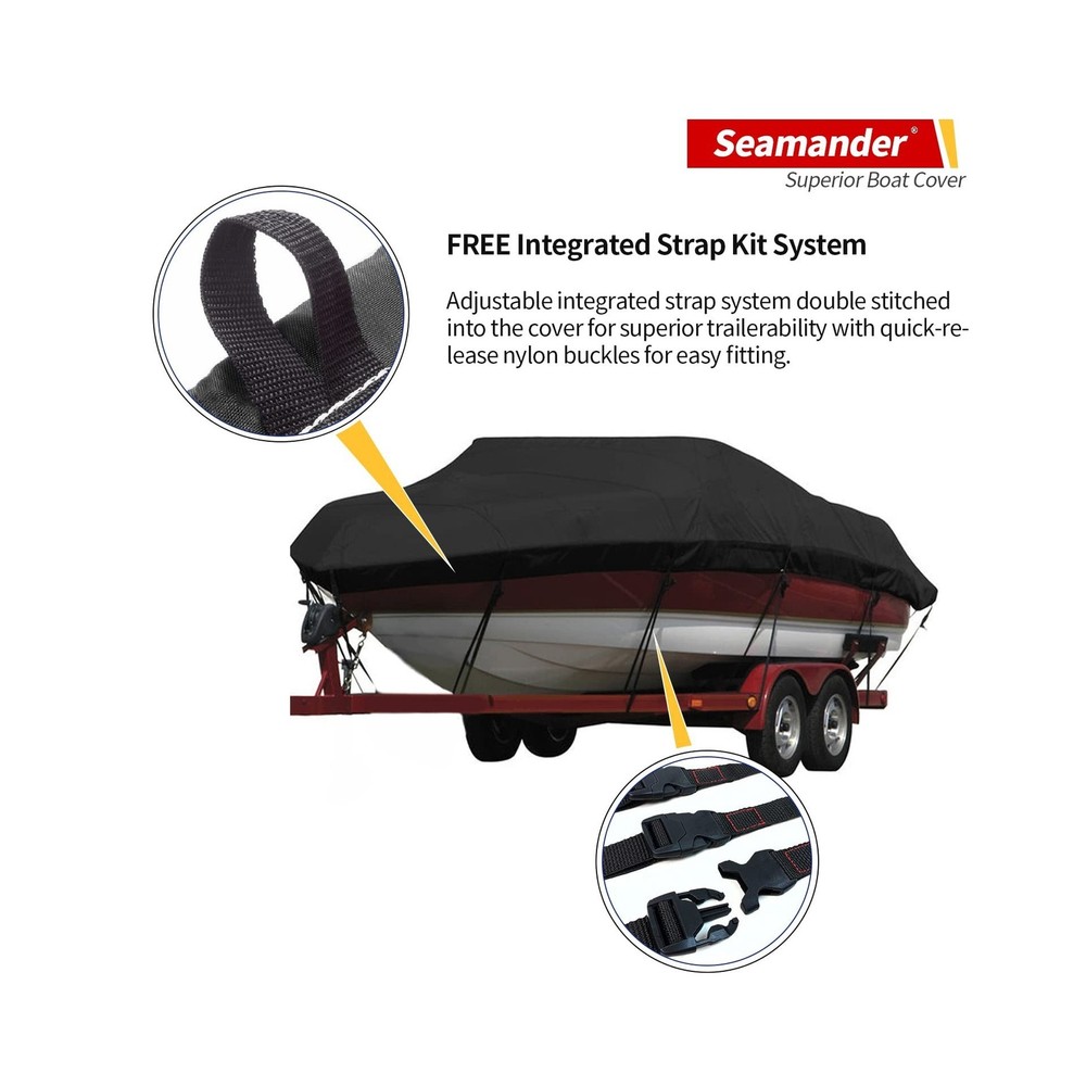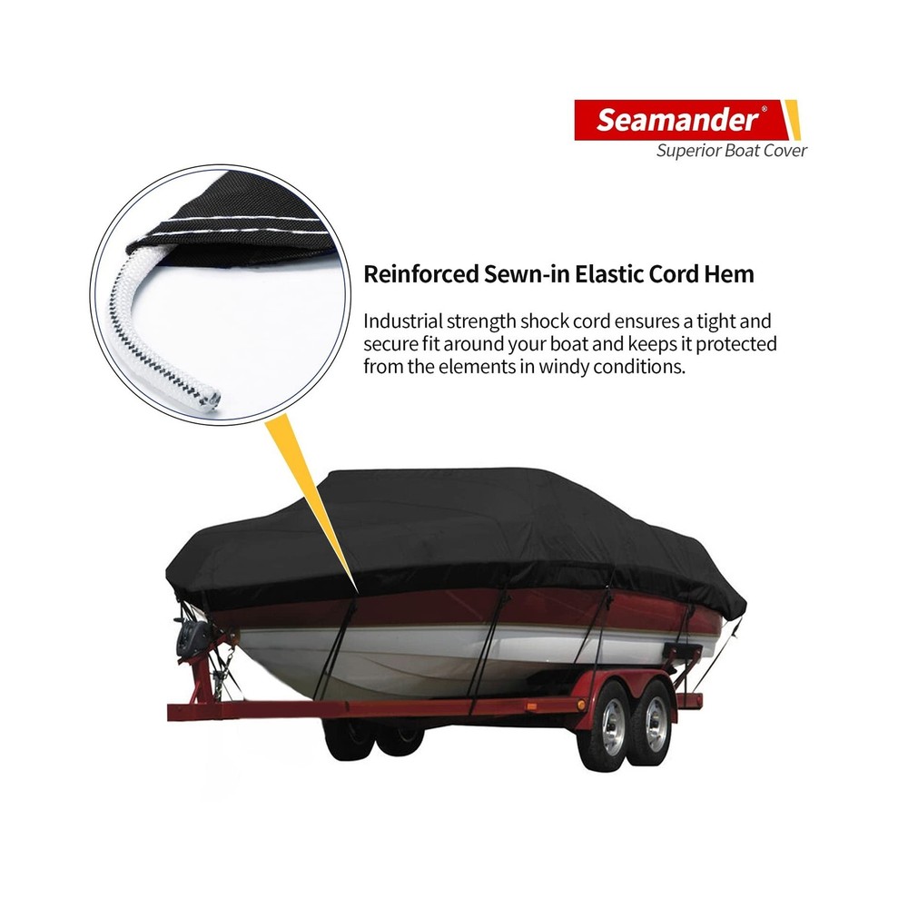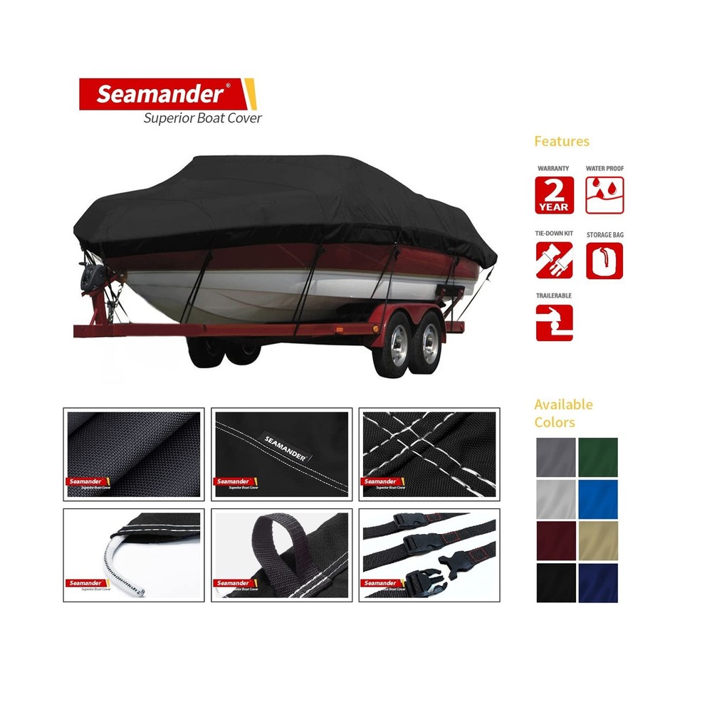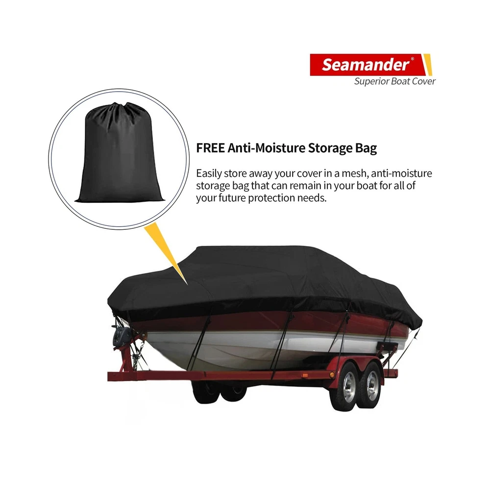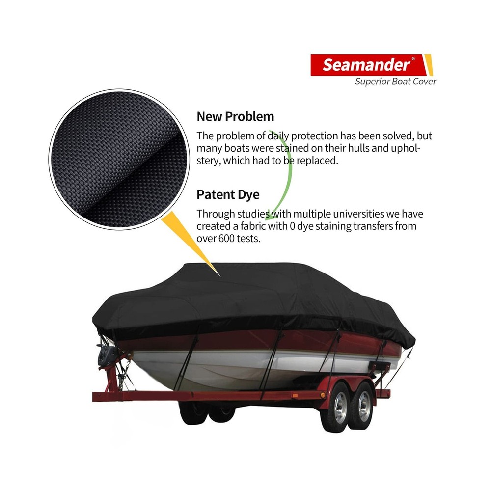 Seamander Waterproof Boat Cover, Solution-Dyed Yarn Marine Grade Cover Fits 14' to 16' ft Bass, V-Hull, Tri-Hull, Fish & Ski, Runabout Bowrider Boats - Heavy Duty Canvas Black 68' Width Description Features: Heavy-Duty Protection Constructed from long-lasting solution-dyed canvas fabric with a waterproof PU coating and anti-UV finish. This boat cover is built to withstand tearing, fading, wetting, and cold cracking. It provides year-round protection for your boat, keeping it safe from harsh weather conditions Universal FitDesigned to fit a range of boat types, including Jon boat,V-hull fishing boats, V-hull Tri-hull runabouts, bass boats, Fish and Ski boats, and Pro-style bass boats. Suitable for boats measuring up to 14ft-16ft long with a beam width of up to 68in. Secure FitFeaturing a heavy-duty elastic cord sewn around the hemline, this cover offers a secure and snug fit .The integrated buckle and adjustable strap tightening system make installation and removal quick and easy, ensuring to providing 360 degree of all-around protection at all times for your boat. Versatile UseIdeal for boat storage, mooring, and trailering, this cover is designed to meet various needs. To prevent water accumulation on the cover, we recommend using a support pole beneath it Package Includedadjustable traps, free storage bag, Heavy Duty PU boat cover (Length: up to 14 ft-16 ft Beam width: up to 68 in). Boat cover fits bass boat, fishing boat, V-hull Tri-hull runabout, Jon boat, Trailerable boat and so on. This heavy duty waterproof boat cover is perfect for boat storage, mooring and trailering. 24 months Warranty24 months warranty and 24 hours customer service for our boat cover. Insist on providing professional products for professional customers,If you have any questions or dissatisfaction for our boat cover, please contact us any time,We will solve the problem for you in the first time until you are satisfied. Product Details: Color: Black Brand: Seamander Water Resistance Level: Waterproof Coverage: 12-26 feet length 68-108 inch width Manufacturer: Seamander UPC Automotive Fit Type: Universal Fit OEM Part Number: PCXXXXXX Color: Black Brand: Seamander Water Resistance Level: Waterproof Coverage: 12-26 feet length 68-108 inch width Manufacturer: Seamander UPC: 606829343573 Automotive Fit Type: Universal Fit OEM Part Number: PCXXXXXX Model: Boat Cover Item Weight: 8.15 pounds Package Dimensions: 15.51 x 10.31 x 7.4 inches Item model number: Boat Cover Is Discontinued By Manufacturer: No Exterior: Brushed Manufacturer Part Number: Boat Cover Bulb Type: Sunshine Special Features: Daily protection increases service life and reduces aging Lift Type: easy for one person Date First Available: July 26, 2018 Delivery We Do Not Ship Outside of the Continental US. Return Policy All items qualify for returns within 30 days of receipt. Buyer is responsible for return shipping on any item that is not damaged. Feedback We take our reputation seriously, we buy and sell online, so we understand the value of trust. If you are unsatisfied with your order, please contact us and we will work with you to resolve it to your satisfaction.