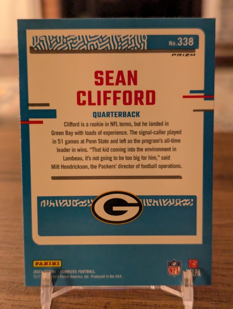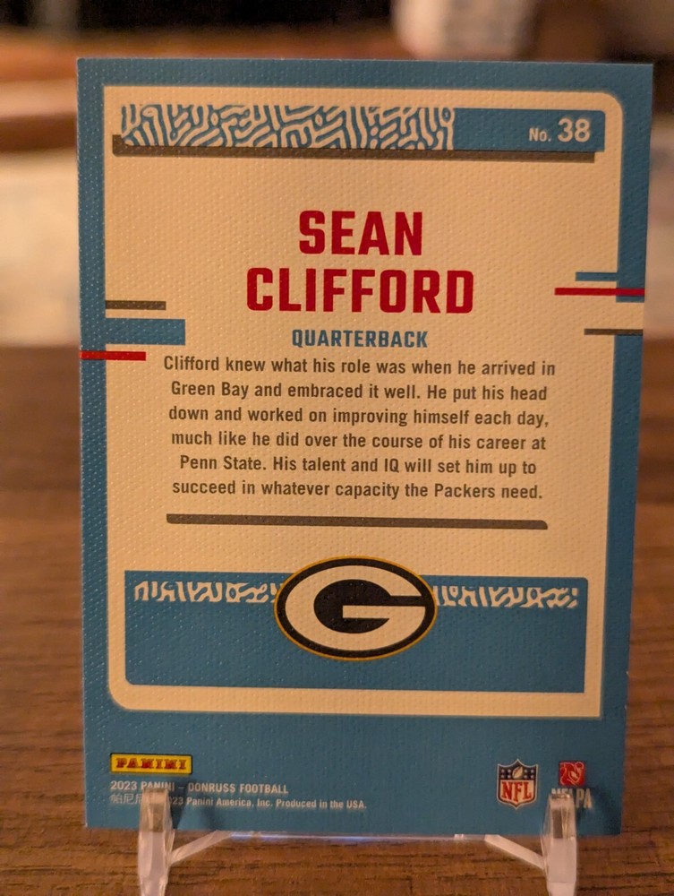 This is a lot of 2 Sean Clifford rookie cards from the 2023 Optic and Donruss sets. Both cards feature the Green Bay Packers quarterback in his debut season. The cards are original and come in standard size. One card is a Rated Rookie card and the other is a Pink card. They are both in English language and manufactured in the United States. This lot is perfect for fans of the National Football League (NFL) and collectors of sports trading cards.