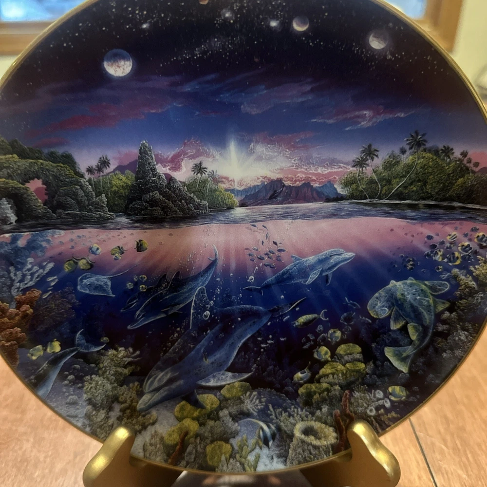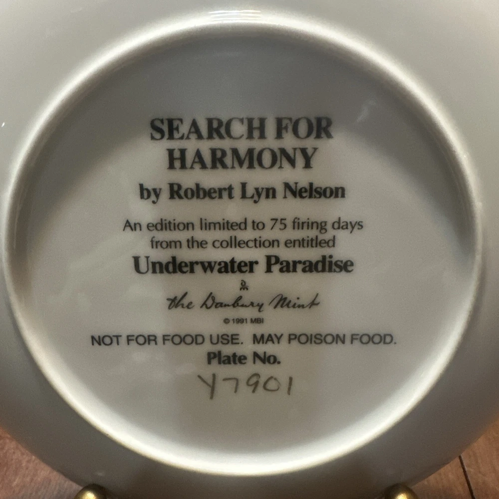 The product is a collector plate titled "Search For Harmony" by Robert Lyn Nelson, part of the Underwater Paradise Collection. Produced by Danbury Mint, this decorative plate is not intended for food use. The design likely features an underwater scene created by the renowned artist, perfect for collectors of decorative plates.