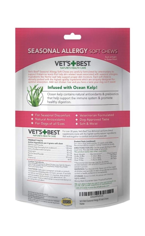 Seasonal Allergy Soft Chew Dog Supplements 90 Ct Exp 09/2022