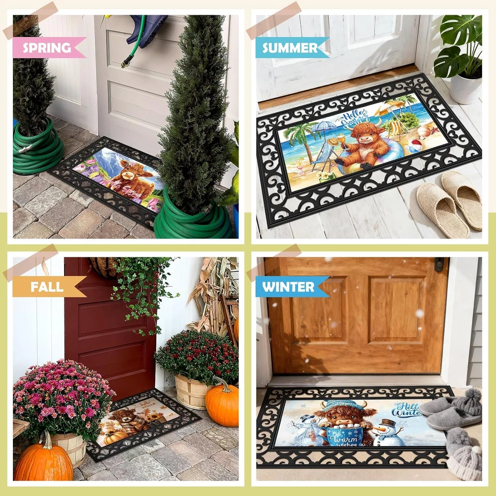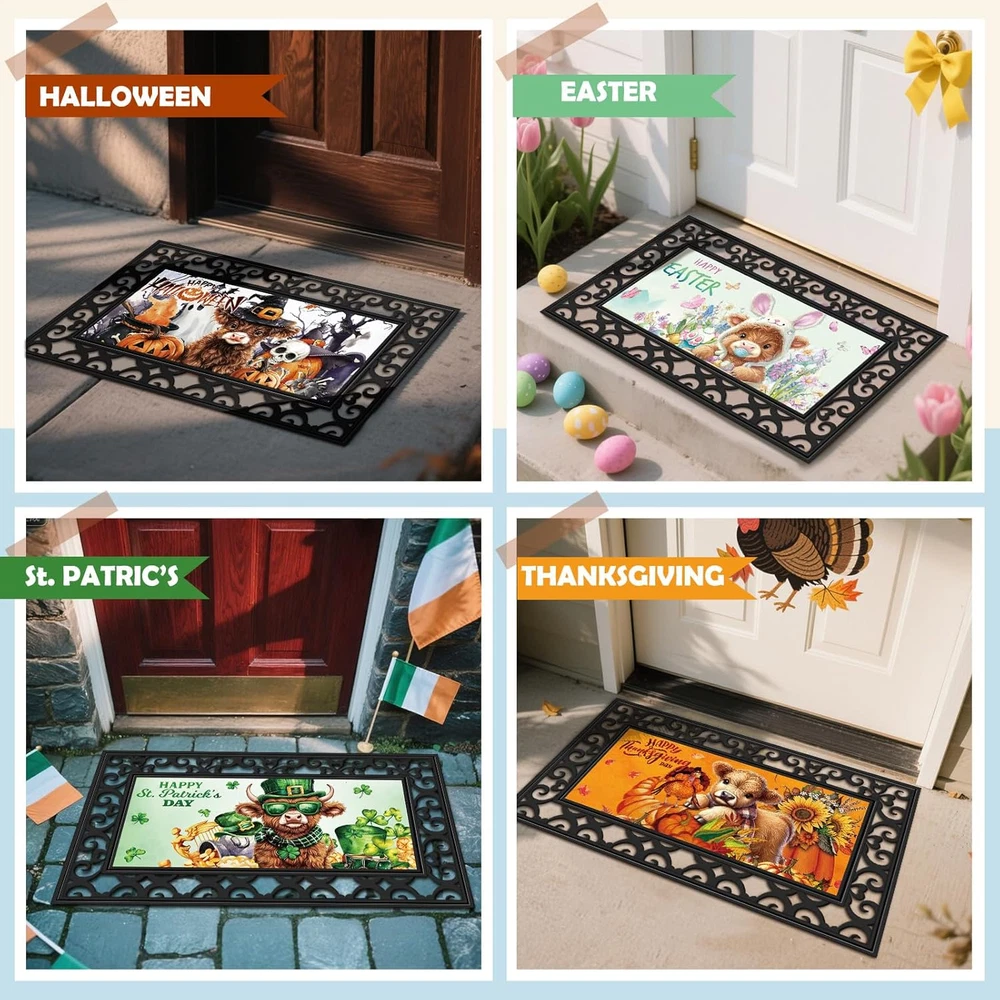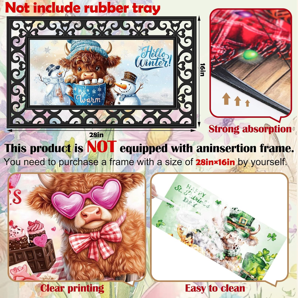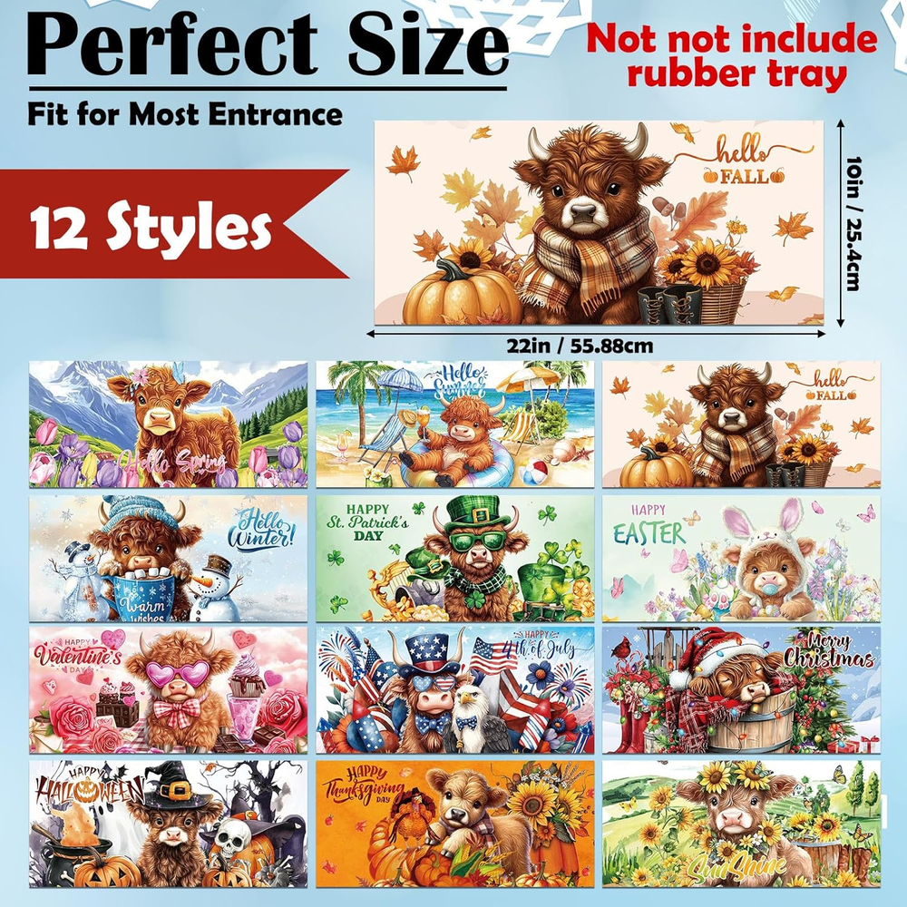 Store New Arrivals Add to Favorite View Feedback Contact GiftByRebecca has been in the US market for over 2 years and offers free delivery to the customer's home with professional customer service Seasonal Door Mat Interchangeable Doormat Inserts Entrance Welcome Mats 22 X 10 Inches Non Slip Mats Gifts for Front Door Valentine'S Day St. Patrick'S Day Decoration (No Frame)(Cow) Description Versatile Seasonal Design: you will get 12 pcs interchangeable door mats set, which features charming seasonal patterns for year round decoration, Fall, Halloween, Thanksgiving, Christmas, Valentine's Day, St. Patrick's Day, Easter, and other classic holidays, including the four seasons of spring, summer, fall and winter, ideal as decorative front door mats that keep your entrance fresh all year Diatom Mud Material: crafted from nice diatom mud, our seasonal welcome doormat naturally absorbs moisture and dirt; The porous structure quickly dries after rain or snow, making it ideal for high traffic while maintaining its elegant appearance; Simply wipe clean with a damp cloth or hose down for thorough cleaning; The stain-resistant diatom mud material repels dirt buildup, keeping your seasonal interchangeable entrance welcome mats looking new with minimal effort Secure Non Slip Backing: each decorative non slip backing mat features a textured underside that stays firmly in place; The innovative grip technology prevents sliding on wood, tile or concrete surfaces, ensuring safety for your family and guests Suitable Size for Most Doors: measuring 22 x 10 inches/ 56 x 25.4 cm, these decorative front door mats fit in standard; The universal size works well for houses, apartments, RVs, and mobile homes as attractive yet functional doorway protection Widely Applicable: this interchangeable door mat set makes a practical housewarming or holiday gift; The 12 different designs cover all seasons and celebrations, offering year-round utility that friends and family will appreciate; It only takes a few seconds to replace the mat for each season, allowing your family and friends to quickly enter the festive atmosphere through these welcome mats Product description Item model number GEM--0690 Is Stain Resistant Yes Style Cow Product Dimensions 22"L x 10.12"W Weave Type Flat Woven Indoor/Outdoor Usage Both Color Seasonal Material diatom mud Pile Height Low Pile Item Weight 6.96 pounds Shape Rectangular Size 22 x 10 inches Construction Type Machine Made Material Feature Not-compostable Back Material Type diatom mud Number of Pieces 12 Model Name GEM0690 Rug Form Type Doormat ABOUT US We offer the best prices around on high quality products. Our E-store includes media such as books, movies, music and games while offering electronics, toys, sporting apparel, clothing, tools, general home, garden items and more. SHIPPING We are always working hard to ensure your package arrives as soon as possible. Please understand that some factors like weather, high postal traffic, and the performance of shipping companies are outside of our control. We offer free shipping to the lower 48 states and ship within 2 business days of payment, usually sooner. We do not accept P.O. Boxes. Please provide a physical address. For shipping outside of the continental USA, we only use eBay's Global Shipping Program. The item is shipped to KY and then sent to the rest of the world. International customers are responsible for all duties and taxes. Continue to 'check out' to calculate costs for shipping the item to your country. Messages regarding eBay's Global Shipping Program MUST be directed at eBay EXCLUSIVELY. RETURNS We offer a 30-Day Return Policy on items in which you are not completely satisfied with. You have the option of a full-refund or an exchange of the item. No returns are available on items shipped outside of the USA PAYMENT We accept PayPal. CONTACT US This page content is yet to come Please ad us to your favorite seller and visit again later Thank You CUSTOMER SATISFACTION We try our very best to make sure every customer is completely satisfied. If there's a problem, message us! We're happy to help. WE ACCEPT