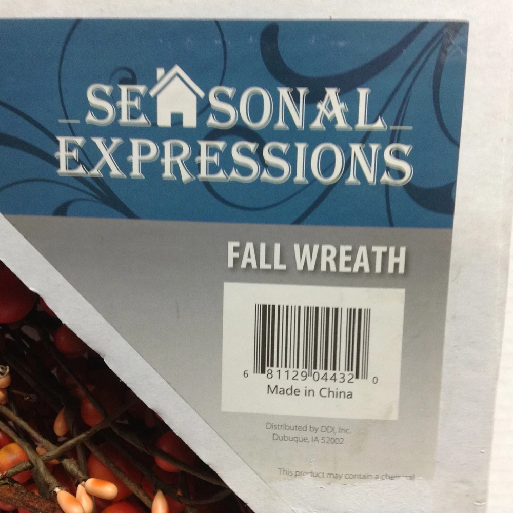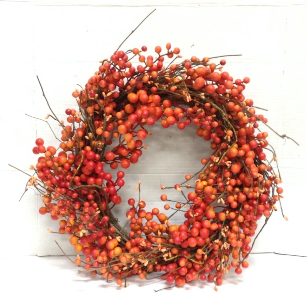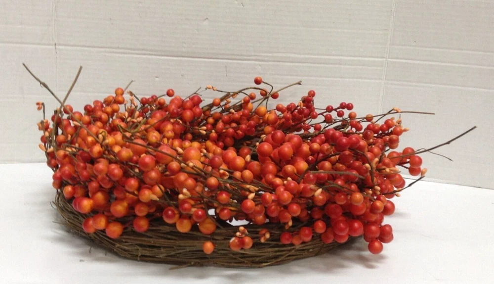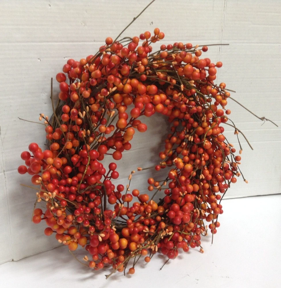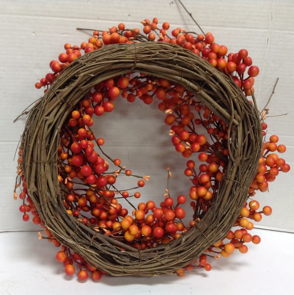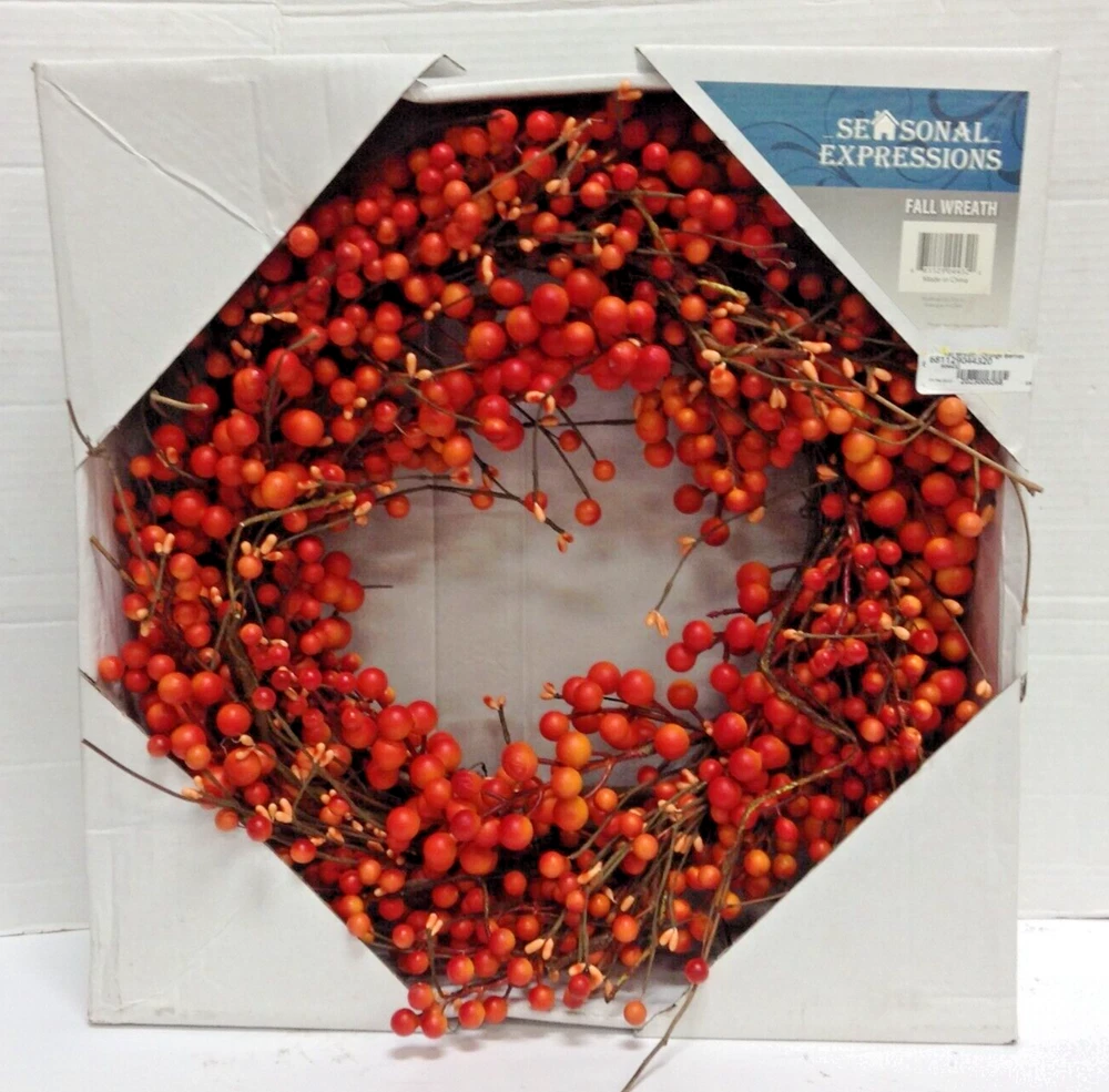 Seasonal Expressions Fall Orange Berry twig WREATH New Approximate Size: 20"diameter x 4" thick Add a touch of autumnal charm to your home with this beautiful Seasonal Expressions wreath. this door decoration features orange berries, perfect for adding a pop of color to your home this fall. Whether you're celebrating Thanksgiving or simply looking to spruce up your home décor, this wreath is sure to impress. Made from artificial materials. With its beautiful design and eye-catching color, this wreath is a must-have for any home. EMAIL WITH QUESTIONS