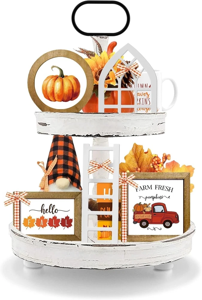 Add a touch of classic farmhouse charm to your dining room with this Seasonal Fall Tiered Tray Decor Set. Crafted from birch wood, this medium-sized figurine features a charming scarecrow character in a yellow and black color palette. Perfect for Thanksgiving or any room in your home, this free-standing unit is a great addition to your seasonal decor. The tray is designed with a tiered pattern and requires no additional parts for display. Clean with a damp cloth and enjoy the matte finish on this classic piece. Bring a touch of holiday cheer to your home with this Seasonal Farmhouse Fall Tiered Tray Decor Set.