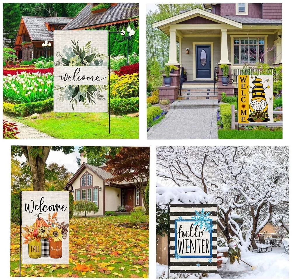 1. Super Value: 10 Pack garden flags for every important holiday, season and family occasion, 100% burlap material, higher quality, durable, weather and fade resistant, keep the flags flying for a whole year. Great gifts for your family and friends. 2. Double Sided: Double side with vibrant, colorful and adorable pattern, both sides are readable. 3. Easy to Install: These yard flags are 12.5 x 18 inch, with about 2 inch opening, and fit all standard sized garden flag pole stand (stand not included), packed in a zipper storage bag, easy to . 4. Super Useful: Dress up your home yard, lawn or garden with these beautiful outdoor garden flags, celebrate with your loved ones, and be the envy of the neighborhood. 5. Premium Quality Printing: of the best parts about our outdoor seasonal flags designs is how bright and cheerful each and every print is. Bright up your outdoor space with our Premium Double-Sided Garden Flags. Personalize your adorable garden with these unique designed seasonal flags.