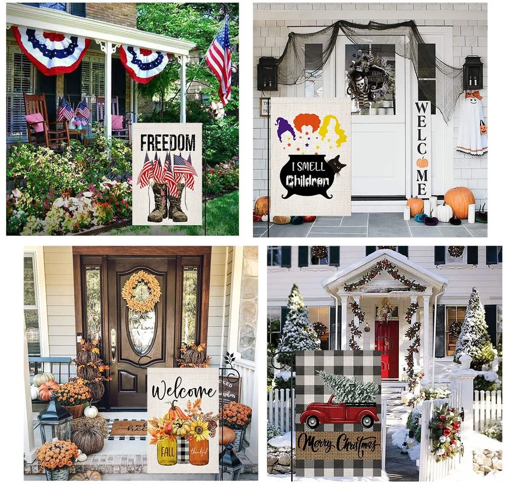Seasonal Garden Flags Set of 10 Double Sided Burlap 12x18 Inch Welcome Easter Spring Holidays Garden Flag, Small Yard Flag for Outdoor Decorations ✓ Free 60 Day Returns ✓ Free Express Shipping Description: Features: 1. Super Value: 10 Pack garden flags for every important holiday, season and family occasion, 100% burlap material, higher quality, durable, weather and fade resistant, keep the flags flying for a whole year. Great gifts for your family and friends. 2. Double Sided: Double side with vibrant, colorful and adorable pattern, both sides are readable. 3. Easy to Install: These yard flags are 12.5 x 18 inch, with about 2 inch opening, and fit all standard sized garden flag pole stand (stand not included), packed in a zipper storage bag, easy to store. 4. Super Useful: Dress up your home yard, lawn or garden with these beautiful outdoor garden flags, celebrate with your loved ones, and be the envy of the neighborhood. 5. Premium Quality Printing: One of the best parts about our outdoor seasonal flags designs is how bright and cheerful each and every print is. Bright up your outdoor space with our Premium Double-Sided Garden Flags. Personalize your adorable garden with these unique designed seasonal flags. Product Details: Theme: Occasion Color: 12x18 Brand: Doncida Recommended Uses For Product: Garden Occasion: Easter Material: Burlap Special Feature: Double Sided Team Name: 12x18 Specific Uses For Product: Outdoor Product Dimensions: 18"L x 12.5"W Product Dimensions: 17.72 x 11.81 x 0.04 inches Item Weight: 1.15 pounds Manufacturer: Doncida Item model number: YMT-001