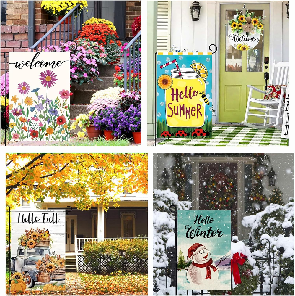 Value Package:12-Pack small garden flags for every season,important holiday and family occasion:Christmas Garden Flag,Spring garden Flag,Halloween Garden Flag,Valentine's Garden Flag,Thanksgiving Garden Flag,St. Patricks Garden Flag,4th of July Garden Flag,Easter Garden Flag,Summer Flag,Fall garden flag, Winter garden Flag,Mother's day garden flag,Our seasonal flags can meet your different needs to decorate your house,garden and lawn all the year! Super Usefull:Charming yard flags will make your house and garden look even more beautiful and make your house extremely attractive. Our garden flags for outside are one-of-a-kind mini flags that you can enjoy for years to come. The brightly colored watercolor design gives your yard a festive look. Double Sided:Our welcome garden flag are “double sided”, with text and graphics readable on both sides; the colors are bright, vibrant and cheerful and colorfast Seasonal Garden Flag Size:These garden flags is 12x18 inch, with about 2 inch opening, and fit all standard sized outdoor flag pole stand (stand not included) Sturdyand Durable:Our yard flags for outside are made of premium spun polyester, which is sturdy, durable, UV resistant, and weather resistant; Don't worry about sun exposure and stormy weather, it can be used in multiple seasons to add a touch of brightness to your garden or yard; Product description Our seasonal garden flags, including 12 holiday themes—Halloween, Thanksgiving, Christmas, Valentine's Day, St. Patrick's Day, 4th of July, Mother's Day, Easter, as well as Spring, Summer, Fall, and Winter garden flag—can meet your diverse needs for decorating your home and garden all year round. Double-Side These garden flags for outside are clearly visible on both sides, and the text content is correctly displayed on both sides. DURABLE & WEATHER RESISTANT Every garden decor flag is specially crafted with a triple-layer construction, built to withstand sun, wind, and rain, keeping its vibrant colors no matter the weather or season. User-Friendly Flags Our welcome garden flags are designed with an approximately 2-inch opening at the top, making them quick and easy to install— just slide them on any standard pole. No tools needed! WHY YOU’LL LOVE OUR 12-PACK GARDEN FLAG SET: 1. Crafted with Triple-Layer Premium Fabric 2. Vibrant Double-Sided Printing 3. Ideal 12x18 Inch Standard Size, Fits Most Garden Flag Stands 4. Fade-Resistant & Colorfast Technology 5. All-Weather Durability 6. Bold, Eye-Catching Designs 7. Perfect for All Seasons and Major Holidays 8. Easy to install and Store