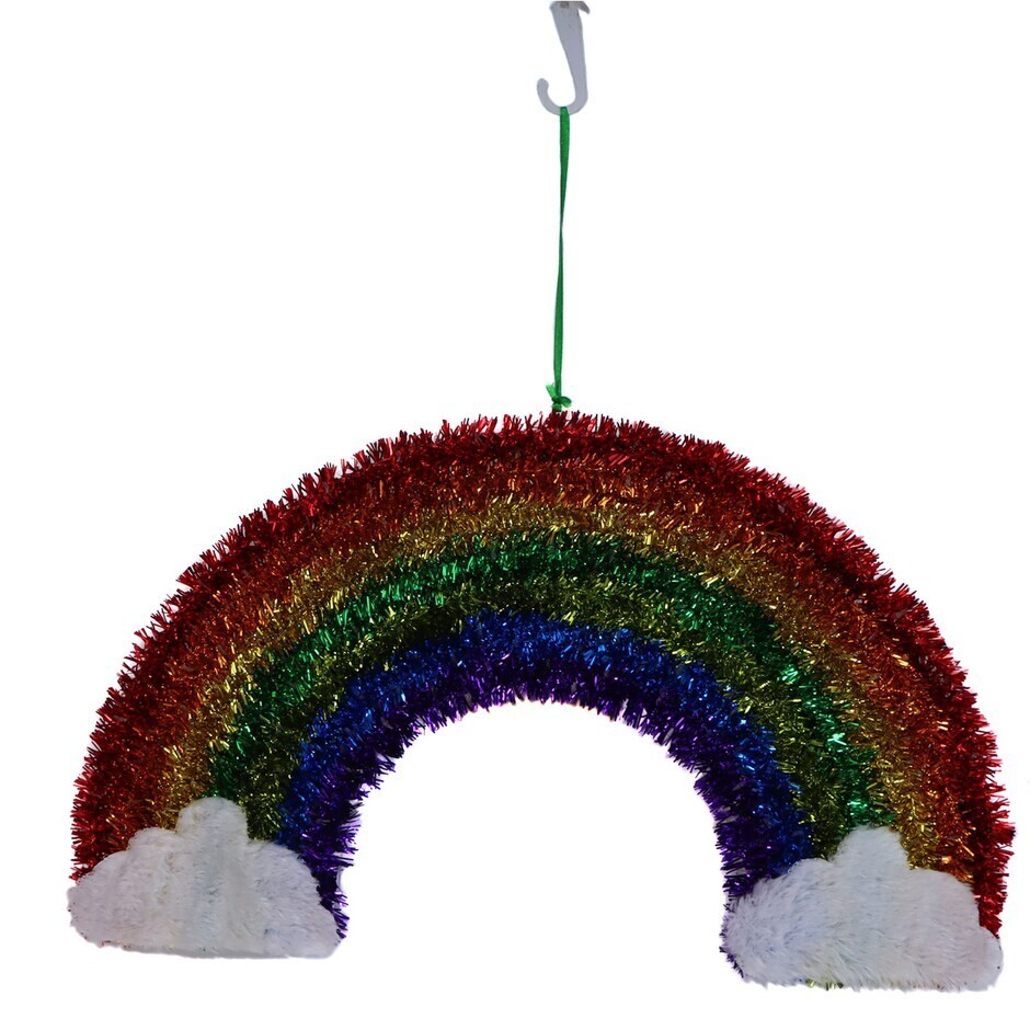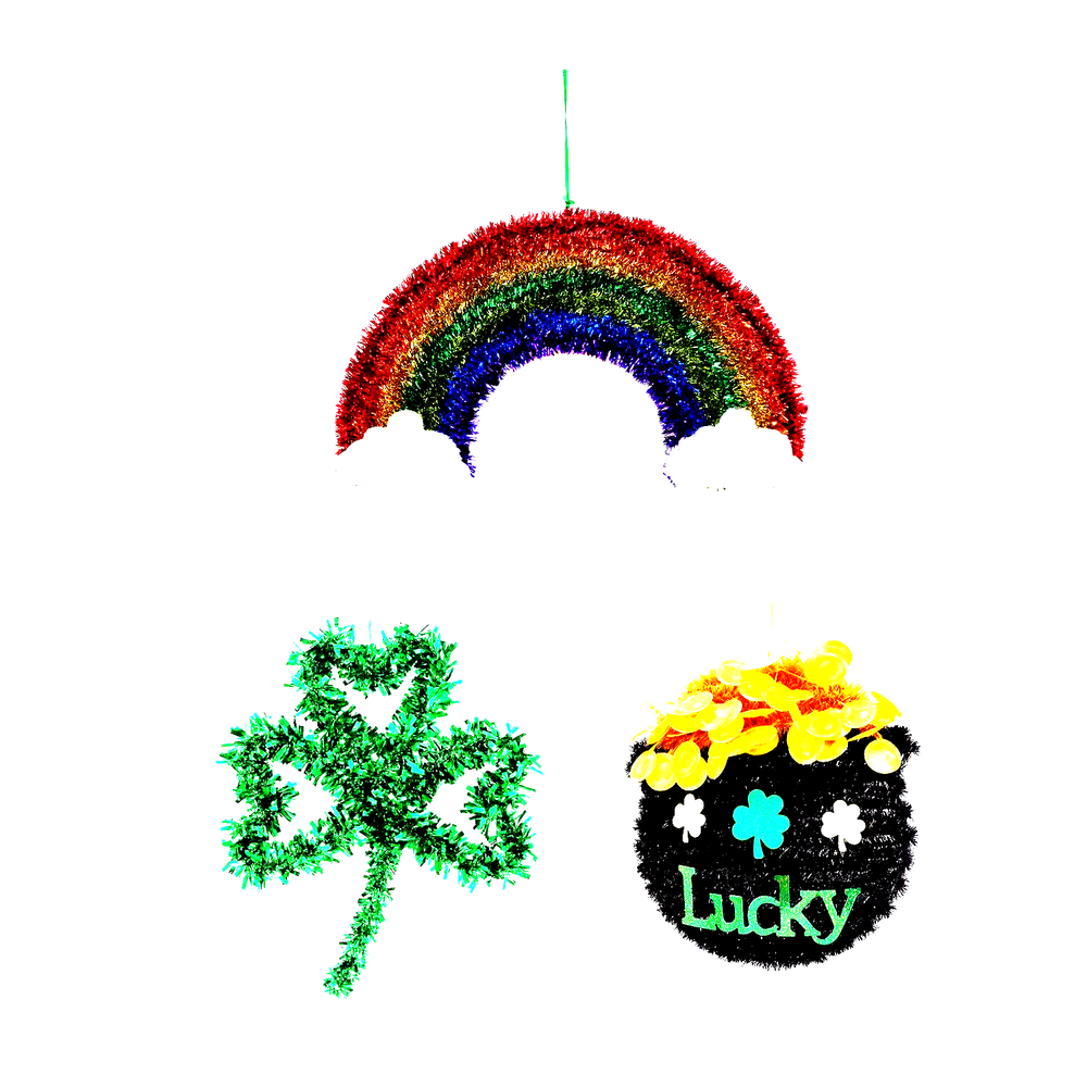 Seasonal Hanging Tinsel Wall Decor adds a festive touch to your decorations. Designed with shimmering tinsel these wall decors bring vibrant sparkle to your home, office, or party space. Lightweight and easy to hang, they are perfect for creating a cheerful atmosphere. Celebrate in style with this fun and eye-catching decor. Choose a pot of gold with the word "Lucky"in green sparkle and shimmering green and gold shamrocks and gold coin accents all on a tinsel with plastic frame background OR a rainbow wth whte puffy clouds at ether end the colors of the Rainbow (ROYGBV) n tinsel on a plastc frame