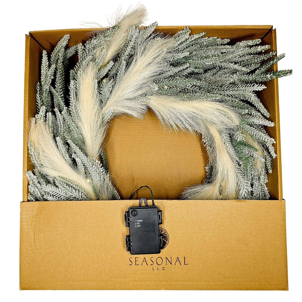 Seasonal LLC 26" Christmas Pine And Pampas Wreath (Retail value $89.99) - 26 inch diameter, snow dusted for a winter look and feel, pre-strung with 50 warm white LED lights, battery operated with 6 hours on/18 off timer, 400 branch tips. For use indoor or covered outdoor location. LED lights are energy efficient and long lasting. Fire resistant and non allergenic. Requires 3 AA batteries (not included). The snow dusted Christmas Pine and Pampas Wreath has a soft and unique appearance. Branches are pre-strung with 50 warm white LED lights that are energy efficient and long lasting. Wreath is battery operated and includes 6 hours on/18 hours off timed operation. Can be displayed on a door, wall or window in indoor or covered outdoor setting. *****Free Shipping - This item comes packed in original manufacturer packaging for shipping and requires time to properly arrange, adjust and spread apart to the desired shape and volume. Branches may need to be separated and will require around an hour of adjustments after shipping. ***** Shop with confidence—my products are carefully inspected and packaged to ensure quality. Fast, reliable shipping within 24 hours and I am available to assist you with any questions. Every purchase helps me continue to provide great products at unbeatable value—thank you for supporting my small business!