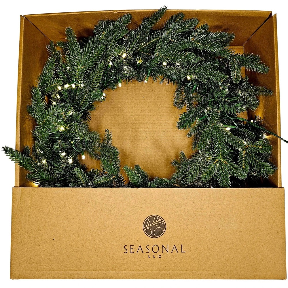 Seasonal LLC 24" Dandan Pine Wreath - 20 Inch diameter, pre-strung with 150 warm white LED lights, plug-in with 6 hours on/18 hours off timer, 375 branch tips. For use indoor or covered outdoor location. LED lights are energy efficient and long lasting. Fire resistant and non allergenic. Has an increased volume of sparkling lights, much more than typically found on wreaths of similar size. The Dandan Pine shines with a glistening glow. Mixed tip design featuring lifelike PE molded branches that create a very realistic holiday decoration. Branches are pre-strung with 150 warm white LED lights that are energy efficient and long lasting. Wreath is plug-in and includes 6 hours on/18 hours off timed operation. Can be displayed on a door, wall or window in indoor or covered outdoor setting. *****This item comes packed in original manufacturer packaging for shipping and requires time to properly arrange, adjust and spread apart to the desired shape and volume. Branches may need to be separated and will require around an hour of adjustments after shipping. *****