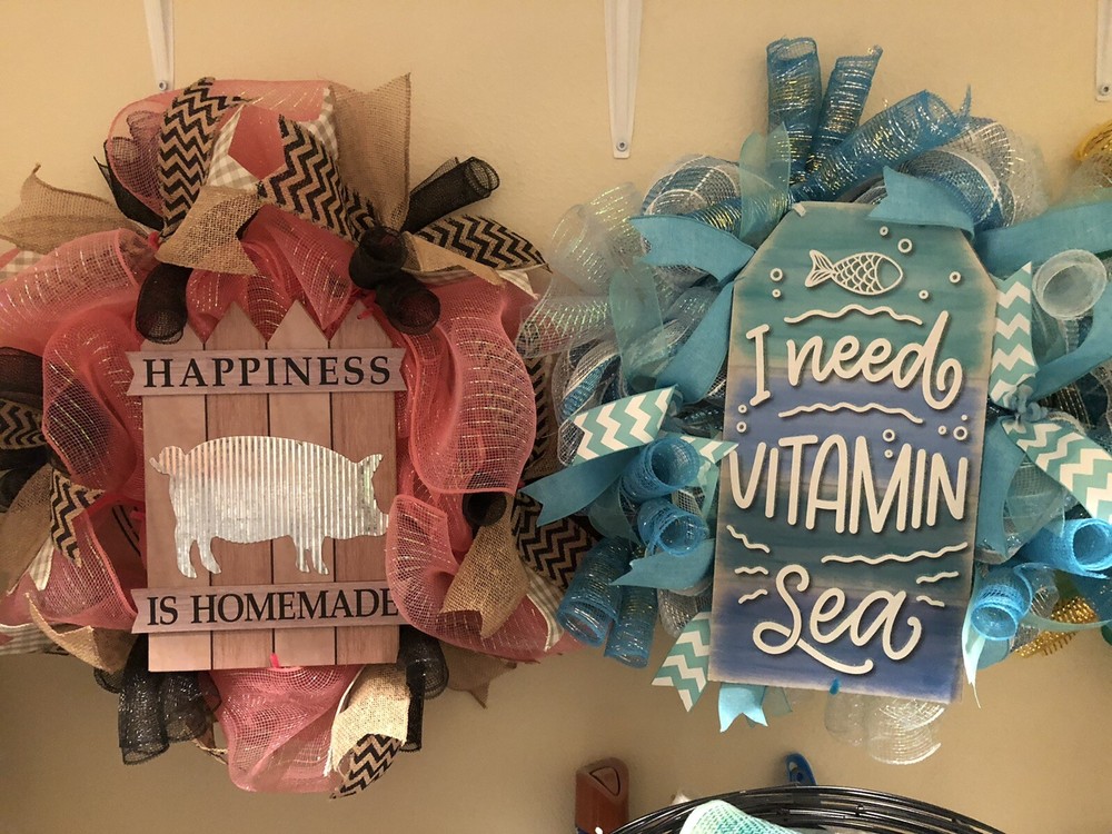 Seasonal Mesh Wreaths. Variety of wreaths for all seasons and events. Made with mesh, ribbon, and signs. Will do custom orders.