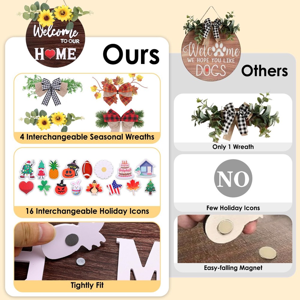 Exclusive Offers Await! Welcome to our stores! We promise you'll be satisfied. Seasonal Welcome Sign Front Door Decoration, Welcome Sign for Front Door, Round Wood Wreaths, Farmhouse, Porch, for All Seasons Holiday Halloween Thanksgiving Christmas Item Details Welcome sign for four seasona wreath meet your front door decoration all year, create a good first impression to welcome your guests. Features: - High quality material wood, not easy to break - Welcome 3D letter, beautiful and long lasting - Hanging and easy mounting, perfect to hang it or set anywhere - Very Rich each holiday icons can be update, tighter stickers - Seasonal Wreaths suitable for most festivals or events of the year Specifications: Material: Wood Craft: Sculpture, printed, polished Shape: Round Style: Farmhouse Size: 12"L x 12"W x 0.8"H Weight: 1.76 pounds Color: Brown Package Included: 1 welcome sign 4pcs seasonal wreaths 16 pcs different holiday icons Notes: There may be little size deviation due to manual measurement. There may be little color difference due to display pixel and light. Product Features Seasonal front door welcome sign: The seasonal welcome wreath for front door decoration with all seasonal styles wreaths and 17 holiday icons such as star flag, heart, chick, maple leaf, cake, football, pumpkin, sun and Xmas tree, you can create a different atmosphere by changing them. Good material: The welcome sign for front door is made of premium quality wood, which have smooth surface, no smell, durable and safe, don't worry about getting hurt.The Classic colors easily brighten up your home decor. Design: Our welcome sign with skilled craftsmanship. Artificial greenery, 3D letters welcome home design and various holiday icons make this wooden door hanging sign look cute and pretty. Widely used: The outdoor welcome sign on the front porch is very suitable for hanging on the front porch door, back door, living room, entrance or leaning on the shelf or anywhere in the home. Perfect Gift : Gift-giving is always an essential thing for your relatives or friends. The welcome sign may be a best gift for friends new home housewarming. The gift you give, the meaning memory they'll keep. Payment Information ⦿ All payments are handled securely through eBay. ⦿ We accept PayPal and all major credit cards. ⦿ Payment must be completed immediately after purchase. ⦿ If there are any issues with the payment, please contact our support team for assistance. Shipping Details ⦿ We only ship to the address provided at checkout. Please verify your address before completing your purchase. ⦿ Orders are processed within 1 business day (excluding weekends and holidays). ⦿ Delivery usually takes 3-5 business days. ⦿ We use trusted shipping services such as UPS, FedEx, and USPS. ⦿ Shipping is available only within the contiguous United States. We do not ship to Alaska, Hawaii, Puerto Rico, or PO Boxes. ⦿ If there are any shipping delays, please contact us for support. Return Policy ⦿ We offer a 30-day return policy for your peace of mind. ⦿ If you are not satisfied with your purchase, you can return it within 30 days for a full refund. ⦿ Please contact us to obtain the return address before sending back any items. ⦿ Returns must be in their original condition and packaging.