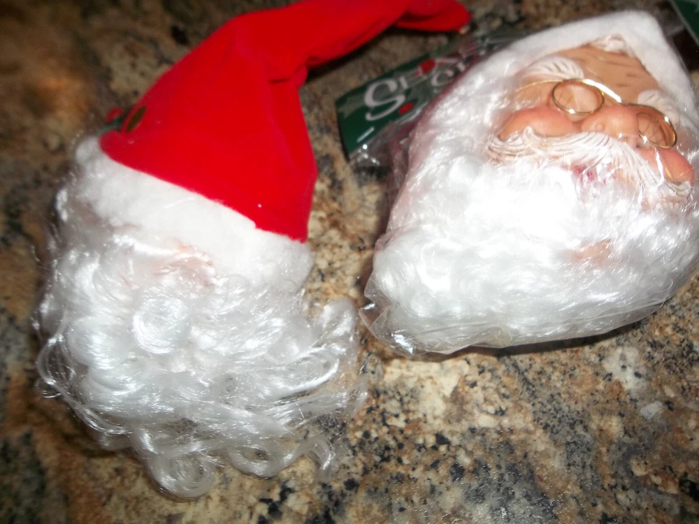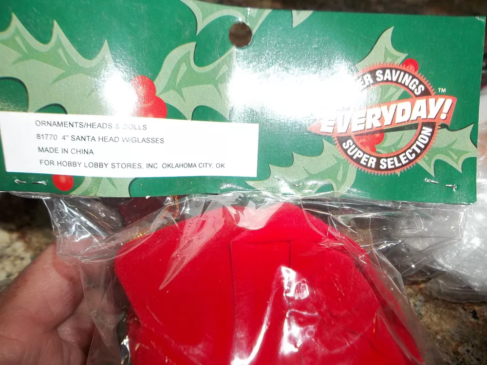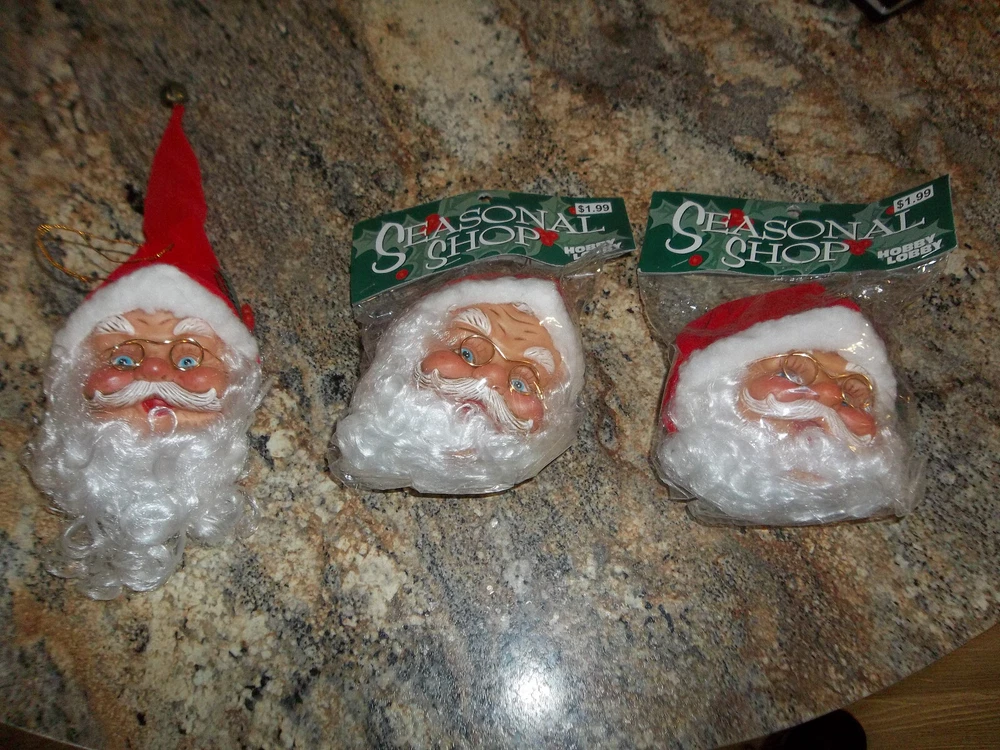 This lot includes 3 vintage Santa head ornaments. These were sold by Hobby Lobby and made in China. Two are still in the original packaging and one is not. These ornaments are about 12 inches long from the end of the hat with the bell down into the beard. The face is plastic, with wire rim glasses, and a velvet hat. These heads have a hole in the bottom which would allow them to be used for crafting as well. Please note that we ebay only as a hobby. We search for items that are unique or useful and try to price them to be affordable. Please check out our other items, as we will gladly combine shipping.