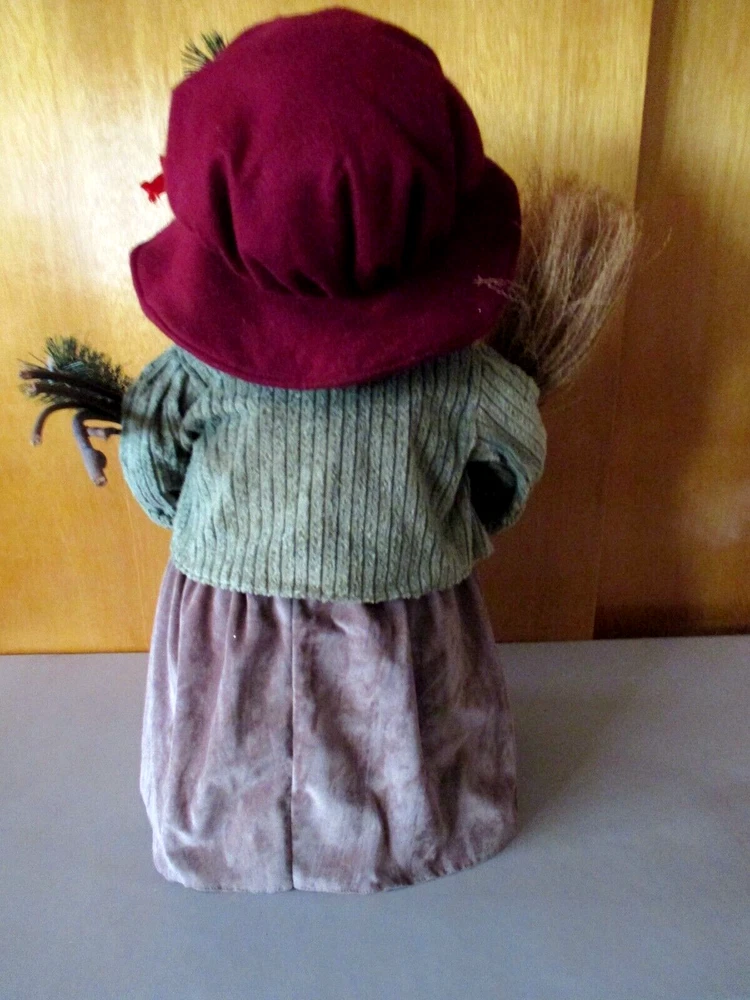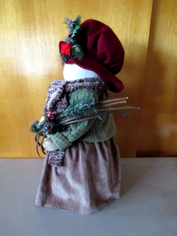 Here is a pre-owned, Snow Woman Figure, approx. 22” tall. She is wearing a green chenille jacket & due to age there is some fading. Under the jacket is a brown top with a scarf & her light brown skirt is a velour fabric. She is also wearing a burgundy felt hat. The figure is decorated with greenery, a broom, some wood pieces, berries, a small bird nest & a red cardinal. Her face & body are an off-white felt fabric. This Snow Woman is ready to join your seasonal décor, clean, odor free & “sold as is.” She is part of my personal collection that I need to downsize. Please see photos for close-up details. My home is SMOKE and PET FREE. Please email me with any questions. Check out my other listings. No international shipping. We will combine shipping on multiple purchases, when possible. THANKS FOR LOOKING