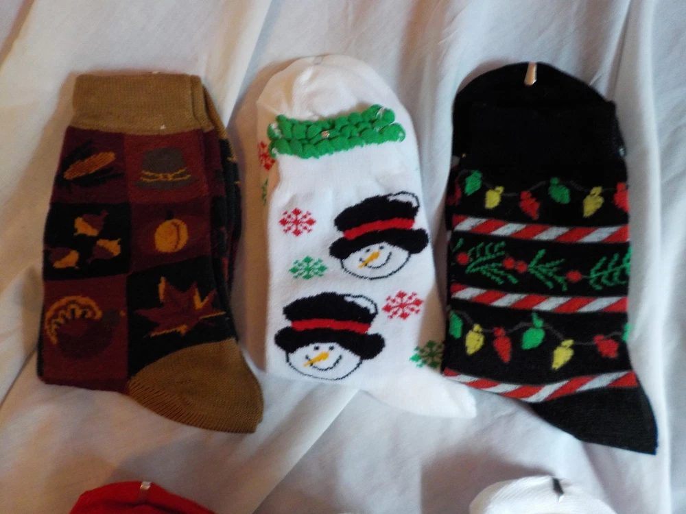 Seasonal Socks VP 6(6) Set of 6 (Autumn, Snowman, Christmas Lights, Valentine's Day Hearts, Easter Eggs/Duck & St.Patrick's Day Cloves). Brand new, never been worn. Set will not be broken up.