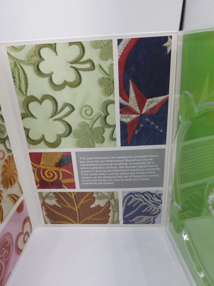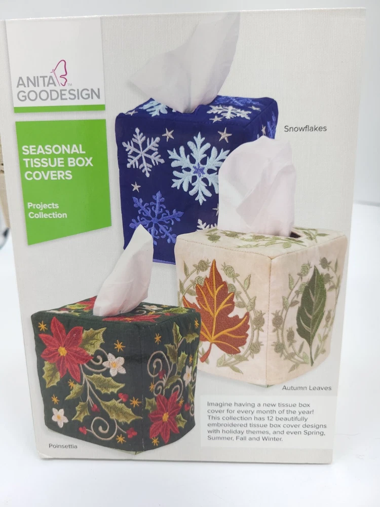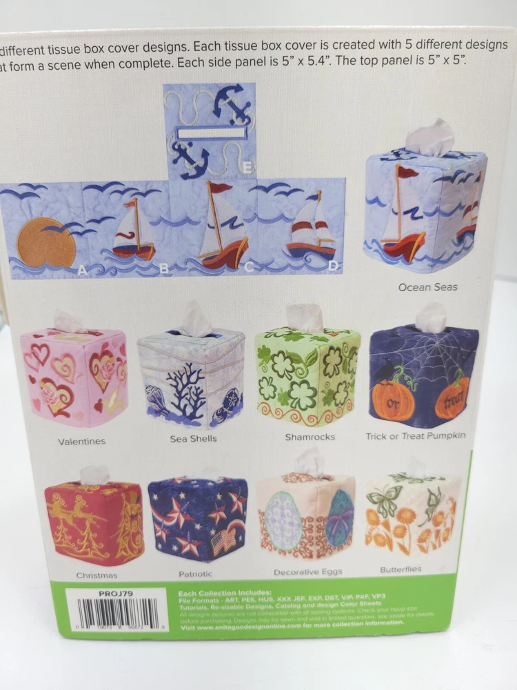 MPN: PROJ79 Brand: Anita Goodesign Country/Region of Manufacture: United States UPC: 079673008729 Formats: ART, PES, HUS, XXX, JEF, EXP, DST, VIP, PXF, VP3 gtin13: 079673008729 Model: Seasonal Tissue Box Covers