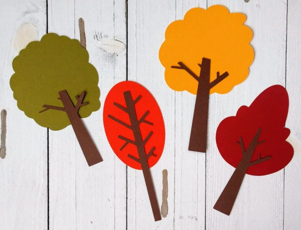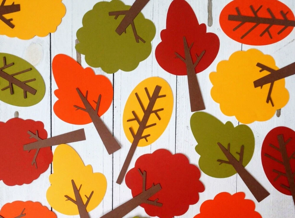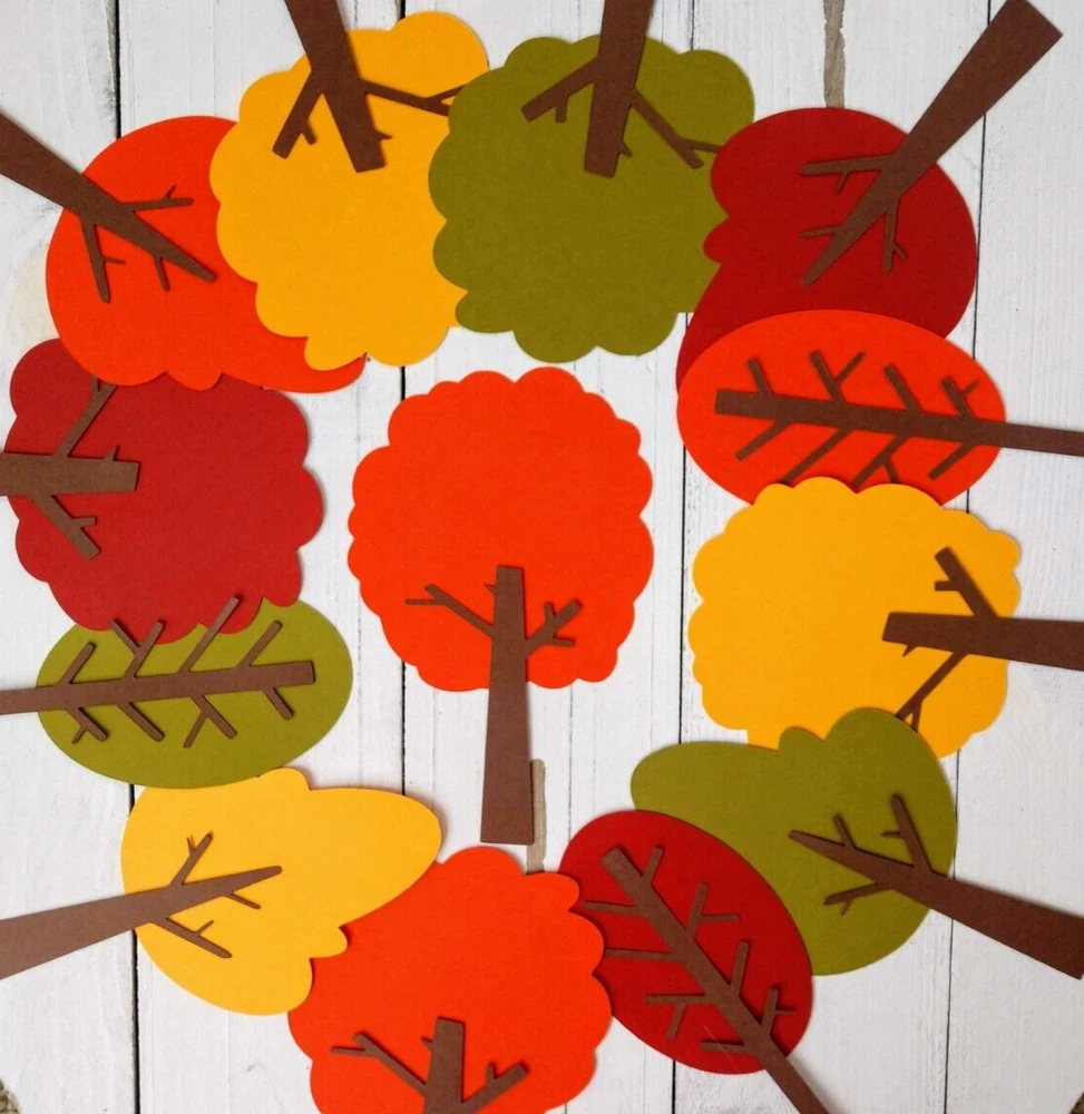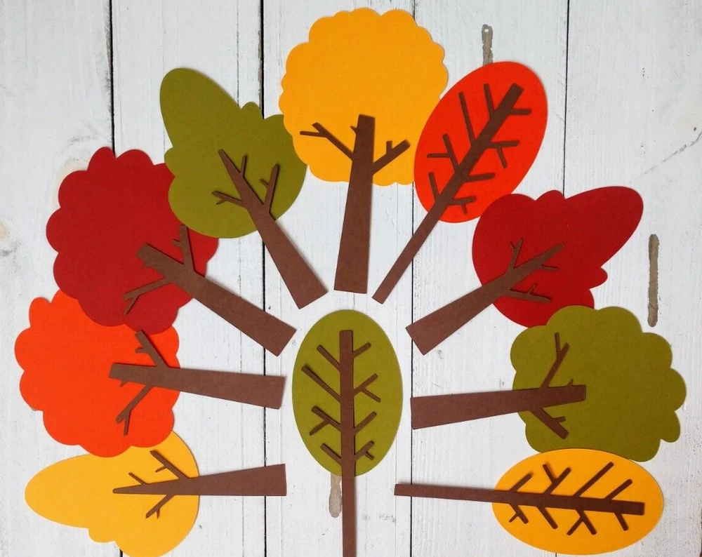 These seasonal tree die cuts are perfect for nature themed birthday parties, baby showers, bridal showers, cookouts, holiday celebrations and more. Also great for bulletin boards, table decorations, banners, posters, scrapbooking, card making, and craft projects. Set includes 16 tree die cuts, in 4 different tree shapes in the following 4 colors: green, yellow, orange and red. The treetops are affixed to a brown tree trunk. Trees are made from sturdy double-sided cardstock. The width of the tree ranges from 2" x 3 1/4" and the height of the trees range from 4 3/4" x 5 1/4".