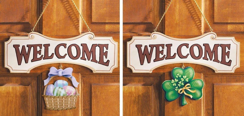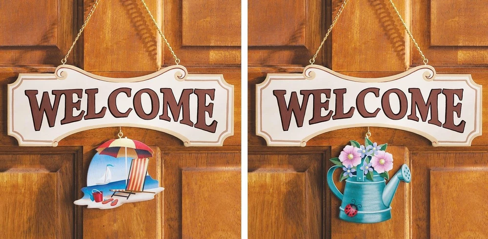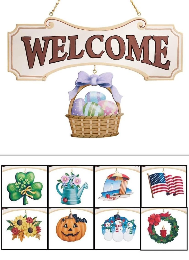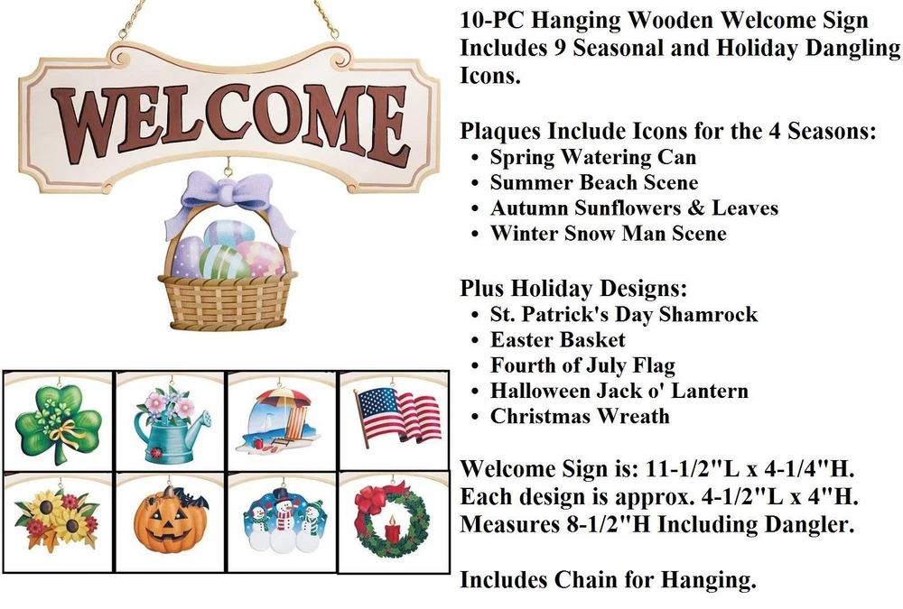 WELCOME Front Door Porch Sign W 9 Changeable Seasonal & Holiday Danglers 12"L Seasonal WELCOME Front Door Wooden Plaque with 9 Interchangeable Danglers 12"L Click image to enlarge Description Seasonal WELCOME Front Door Wooden Plaque with 9 Interchangeable Danglers 12"L. Enjoy a festive welcome for every season with this unique Welcome door sign with interchangeable seasonal and holiday icons. All year long you can WELCOME friends and family with the same sign but change out the dangler at the bottom to match the season or holiday! Details: Set of 10-Pieces 1 "WELCOME" Sign 4 Seasonal Danglers Spring Watering Can Summer Beach Scene Autumn Leaves Winter Snowmen 5 Holiday Inspired Danglers St. Patrick's Day Shamrock Basket Of Eggs American Flag For 4th of July Jack-O'-Lantern Pumpkin For Halloween Wreath For Christmas "WELCOME" Sign Measures 11-1/2"Long x 4-1/4"High Each Dangler Measures Approx 4-1/2"Long x 4"High Danglers Hang From Hook On Bottom Of Sign Sign Includes Chain Attached To Top For Easy Hanging ~Buy more than one item at the same time from our eBay store and save in shipping costs!~ (If buying different items, just put them all in your cart before paying, to get the combined shipping discount!) Shipping We use UPS SurePost, UPS, USPS and FedEx SmartPost to deliver our products to your home, depending on which method is more efficient for your order. We use suppliers for some of our orders and our suppliers will choose the service that is used for these orders. PLEASE MAKE SURE YOUR ADDRESS CAN BE VERIFIED BY USPS. Please allow 7-10 days for the item to reach your home. We cannot be responsible for items shipped to incorrect or incomplete addresses, which may result in the cancellation of your order. YES, we do combine shipping! The highest shipping cost item ships at regular price, and each additional item ships at $2.00 more in additional shipping charges. If you are buying several different items from our store, put them all into your cart before paying to get the combined shipping discount. Terms of Sale Unless otherwise noted, we accept returns up to 30 Days after your purchase, through the eBay Returns System. Please use eBay to contact us if there is any problems or issues with your order. In some cases, we order the item purchased from one of our suppliers, and it is shipped directly from our supplier to the customer. There are times when an item unexpectedly becomes unavailable from our supplier. We do our best to check on all of the items availability several timea a day. If an item is unexpectedly unavailable, we will issue a refund immediately. Contact Us Please use the message center in eBay to contact us. We check our message box in eBay several times a day. If you have any questions or concerns with your order, please feel free to contact us. We care very much about our customers being 100% happy with their purchases. We would very much appreciate you letting us resolve any issues you may have with your order by contacting us first, before taking any other unnecessary actions. Pictures sell! Auctiva offers Free Image Hosting and Editing. 300+ Listing Templates! Auctiva gets you noticed! The complete eBay Selling Solution. Track Page Views With Auctiva's Counter